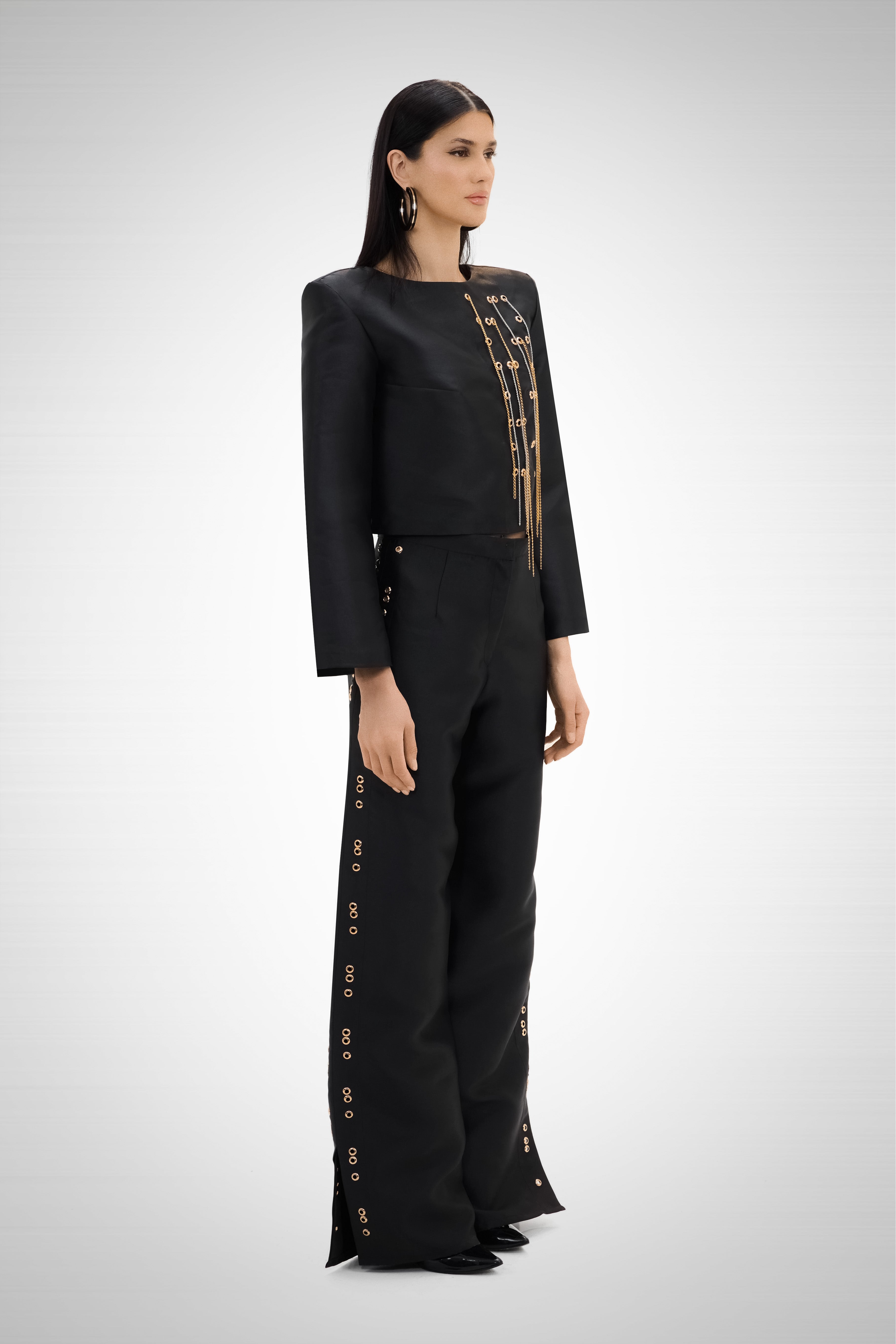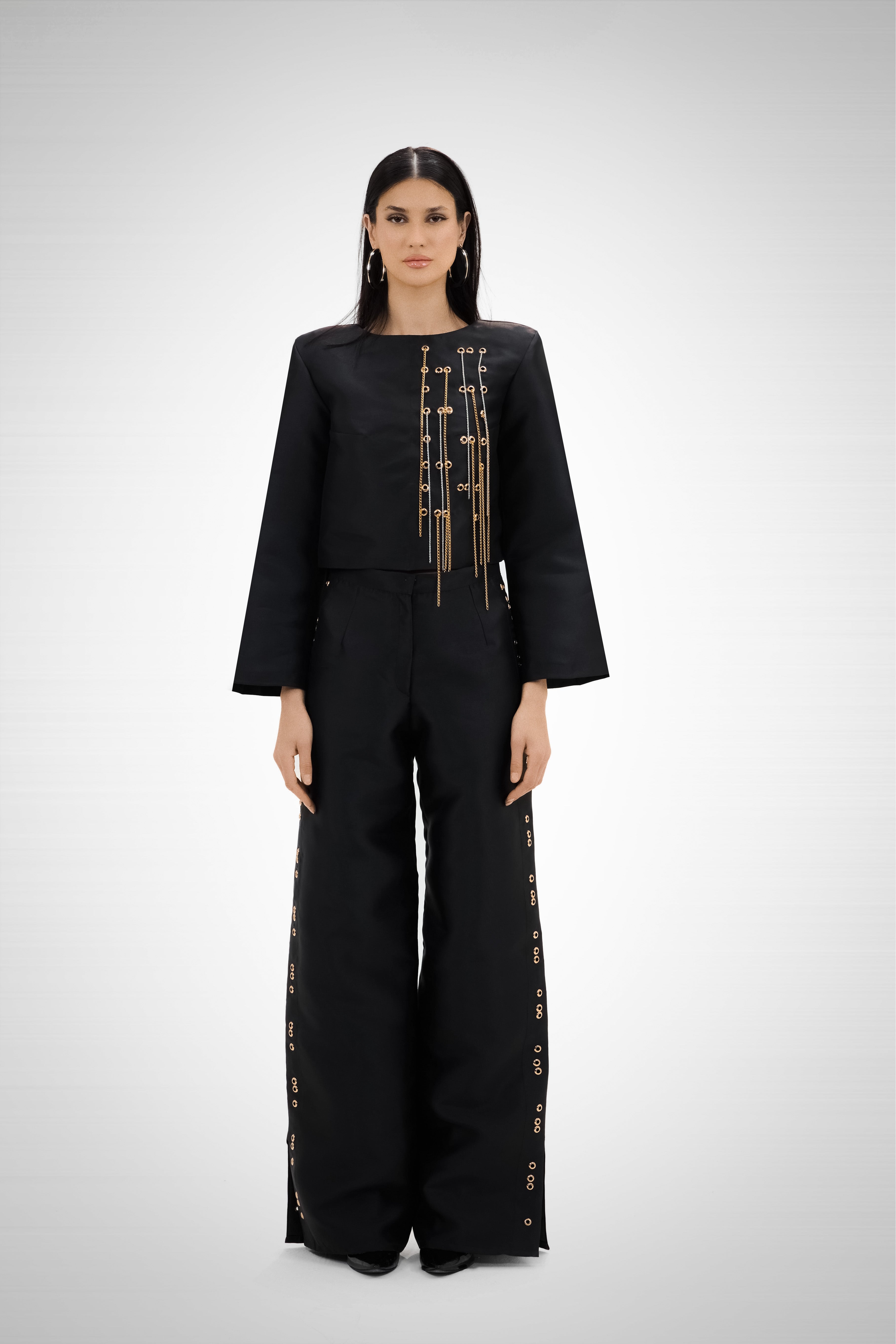 The black constellations set, offered in both black and white, features interconnected rings and chains that run down the front of the top and sides of the wide-leg pants. The versatile silhouette allows the pieces to be worn together or separately.