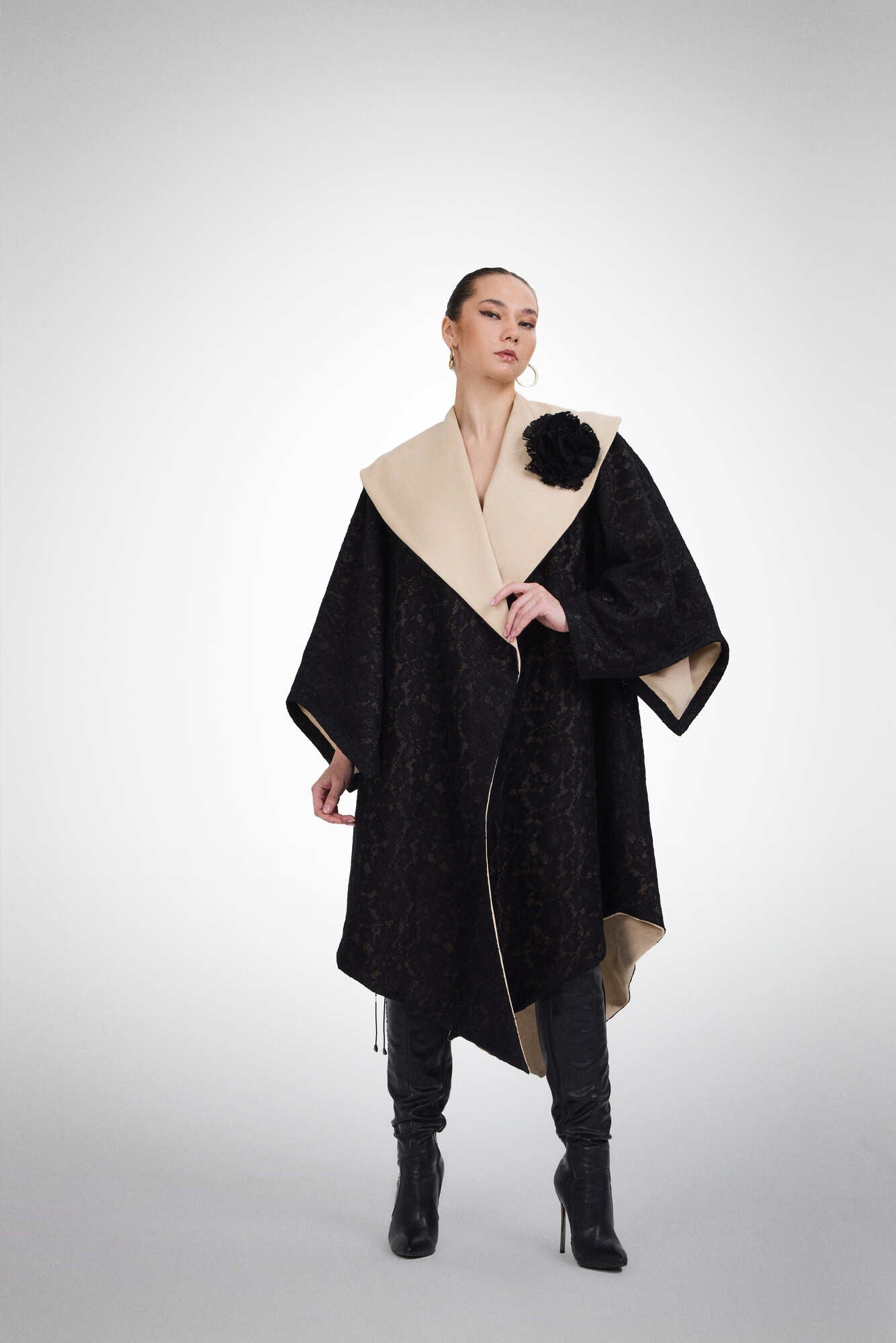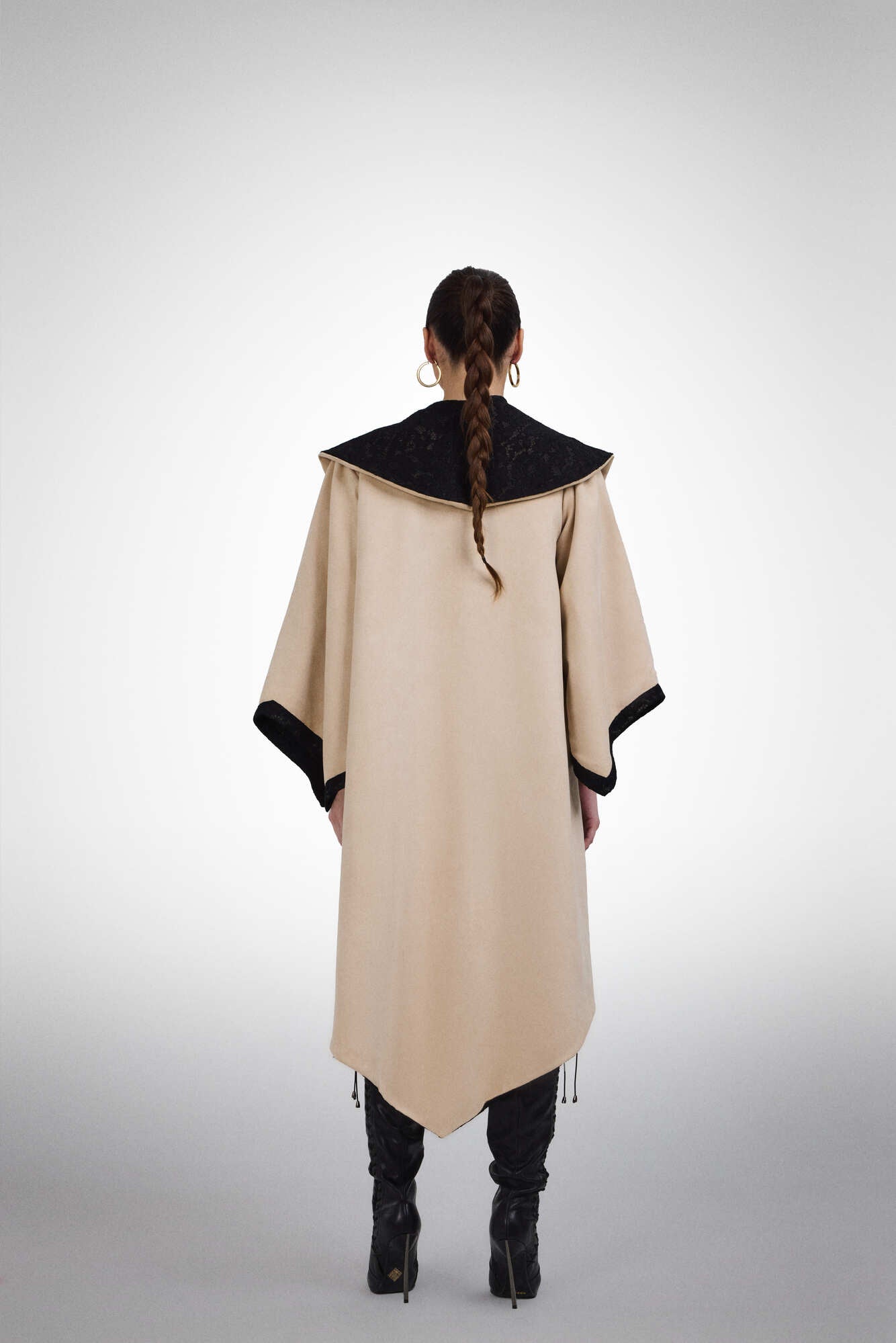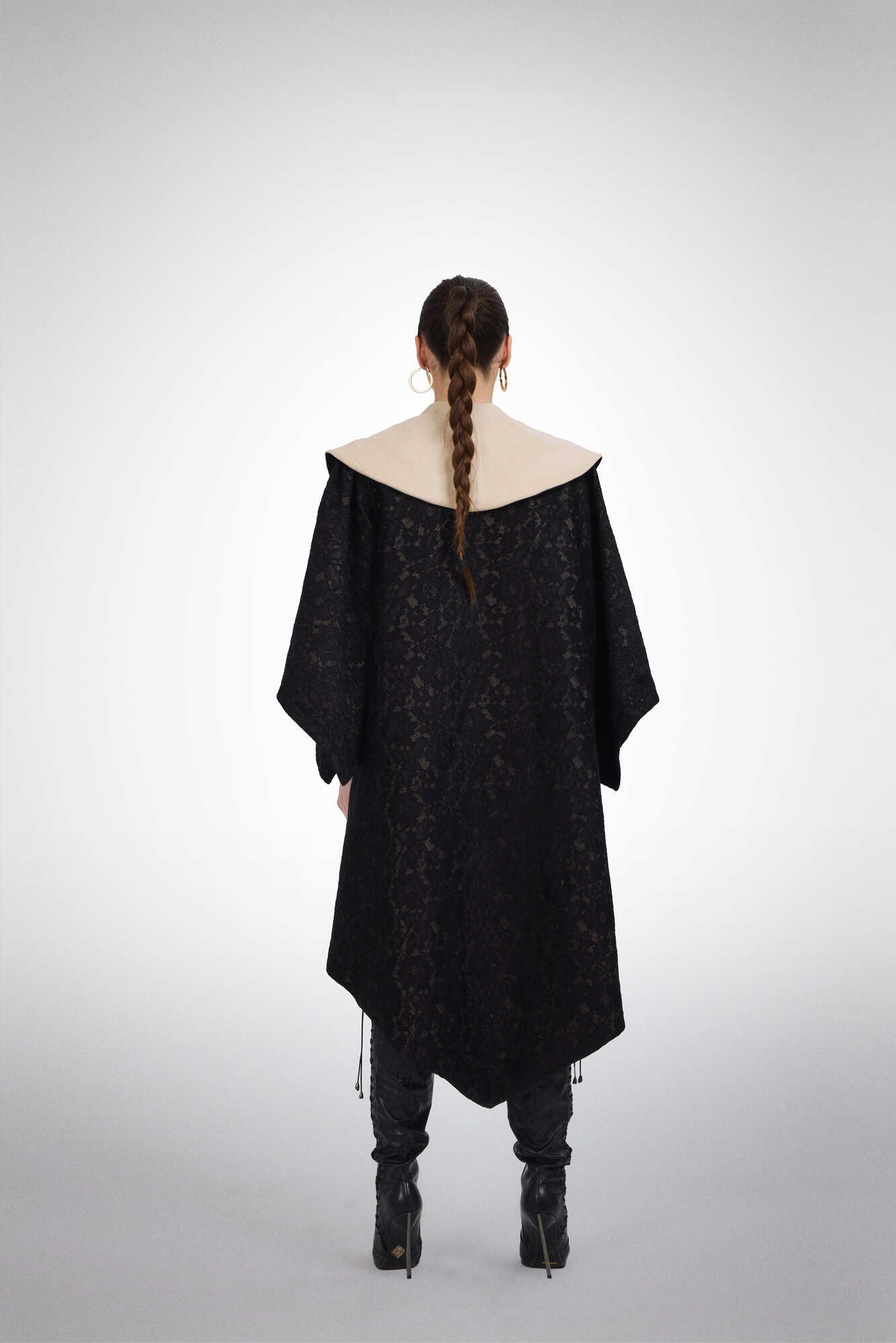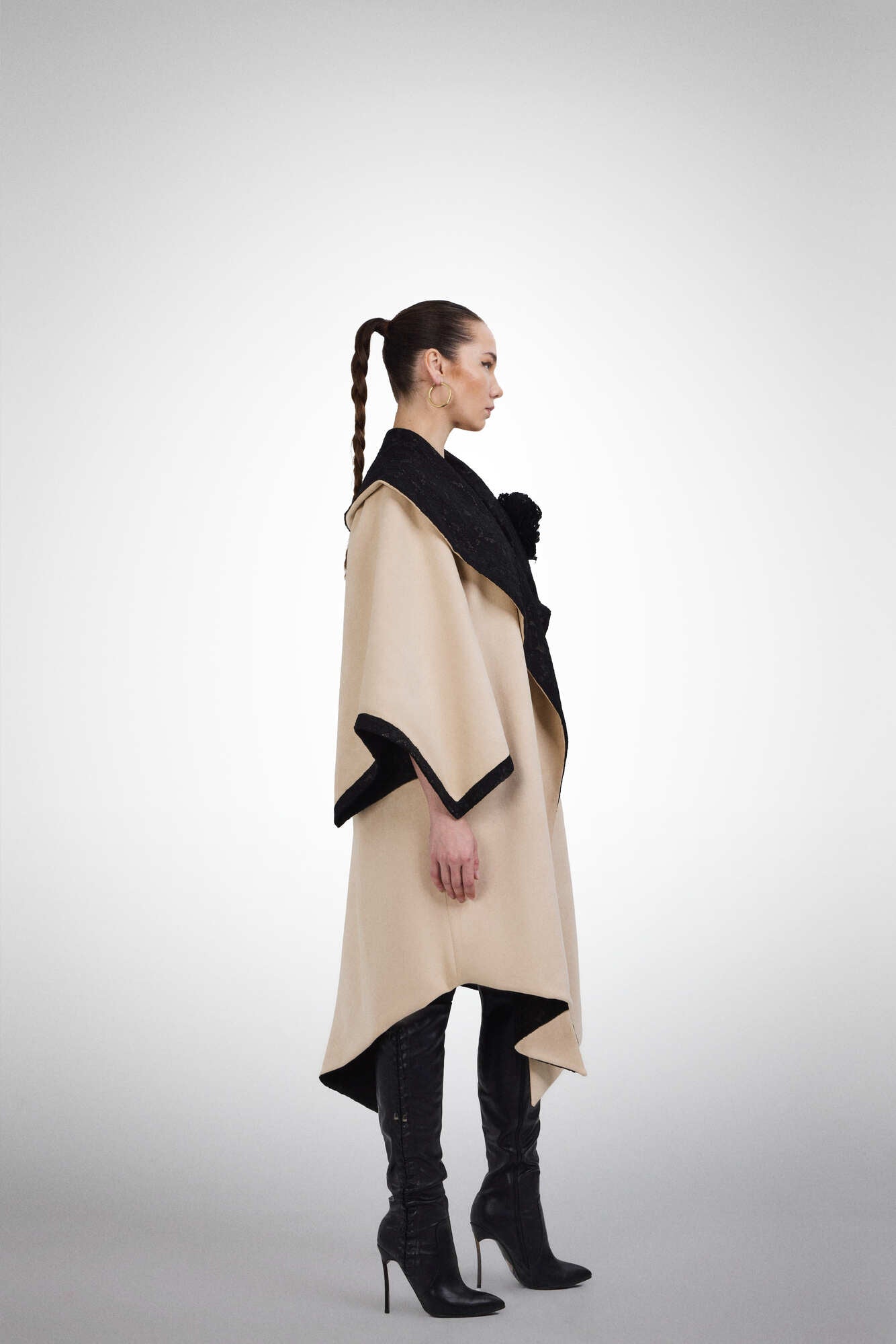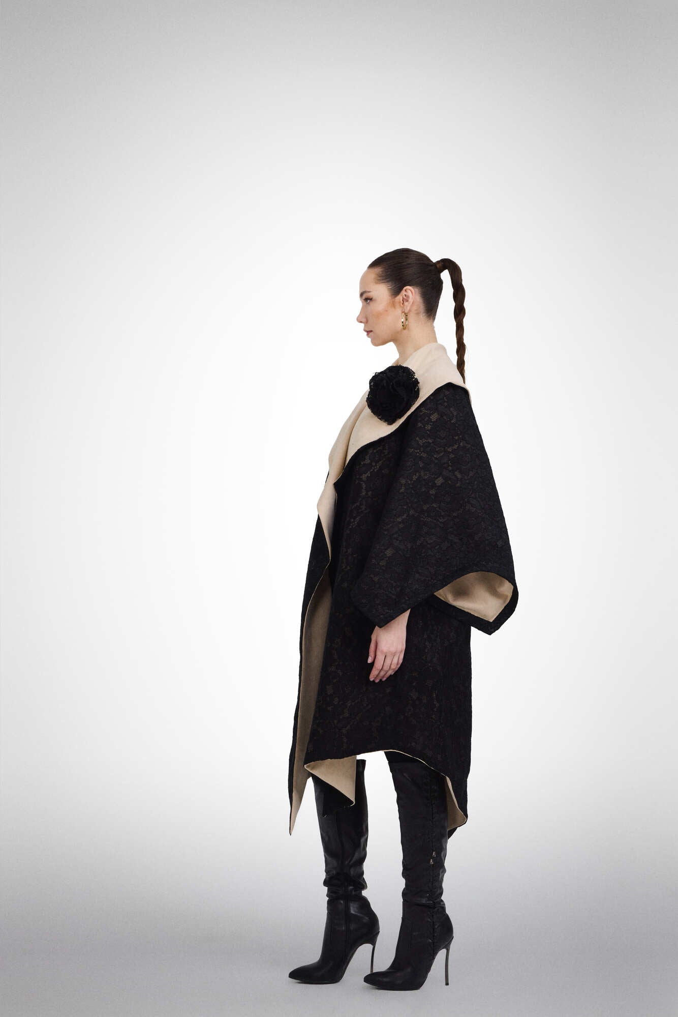 A striking mix of black and beige suede with French lace, balancing strength and delicacy. A bold statement of self-expression and transformation.