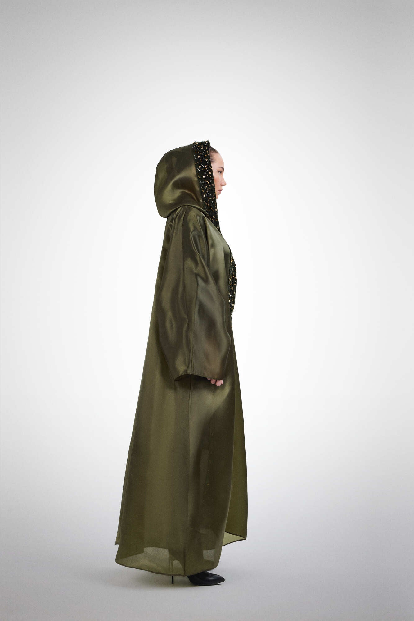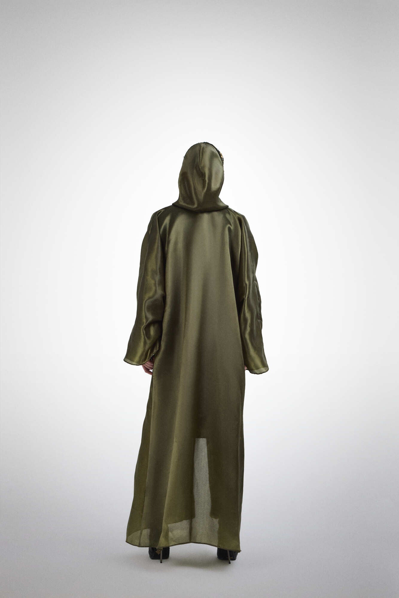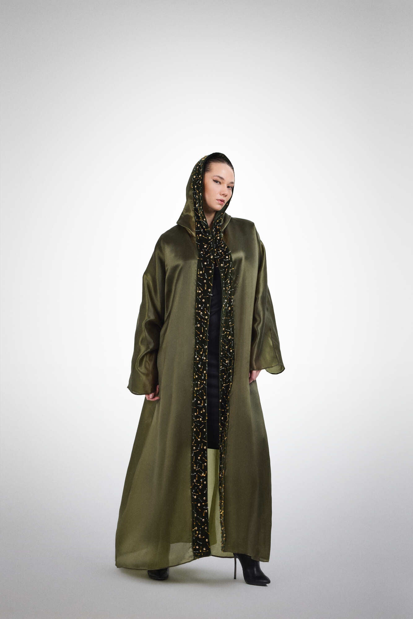 An olive green organza caftan with rich velvet borders and a hood, adorned with intricate luxury details like studs and pins, creating a bold yet ethereal presence.
