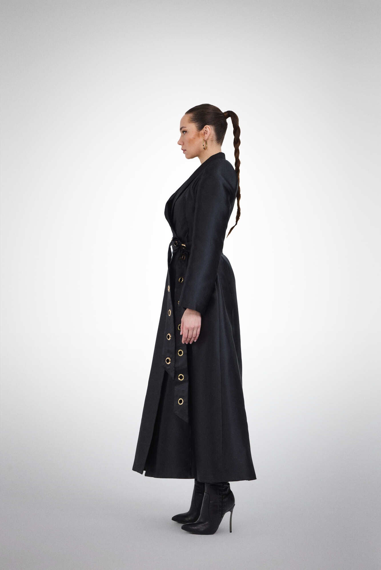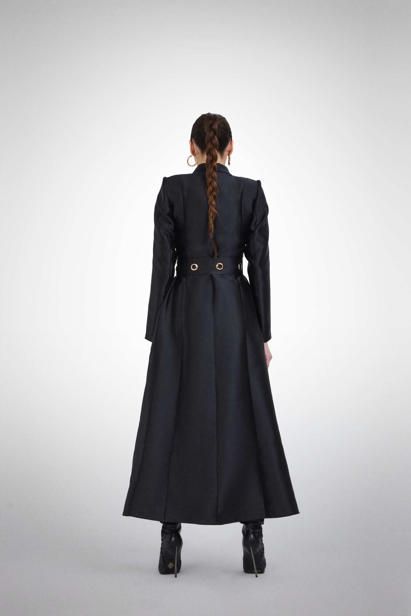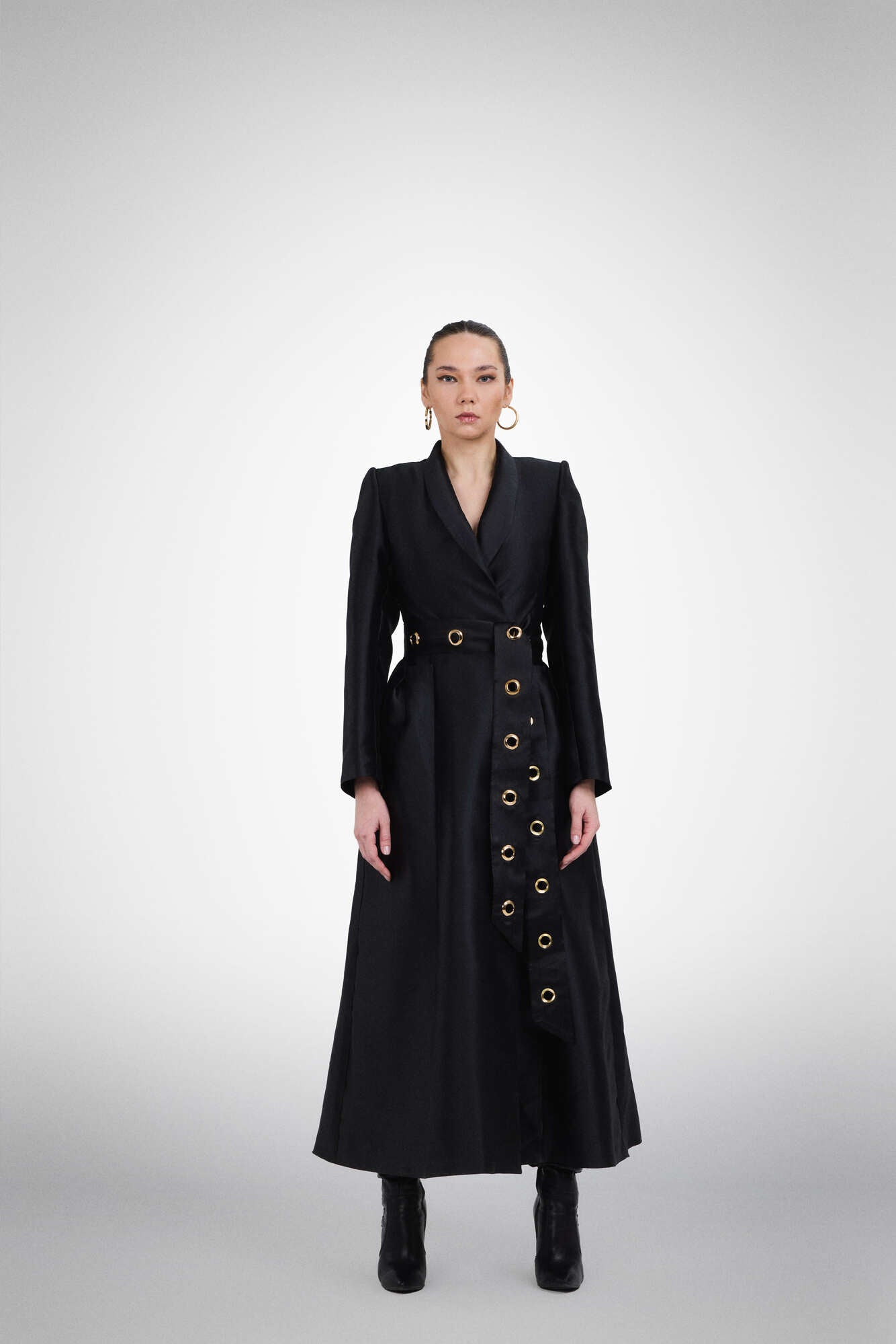 A structured black satin blazer dress with sharp shoulders and a statement ring belt, exuding confidence and refined power.