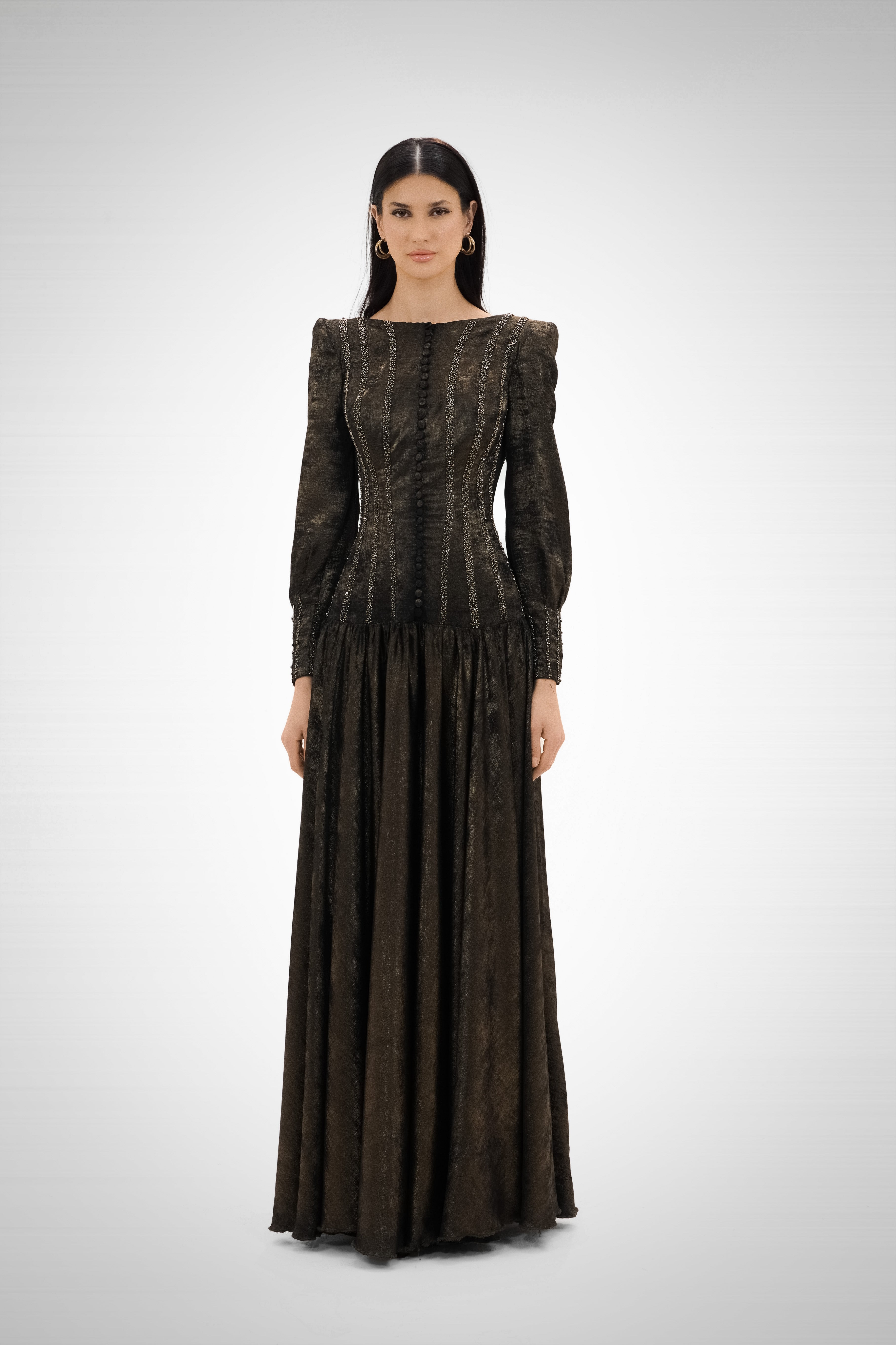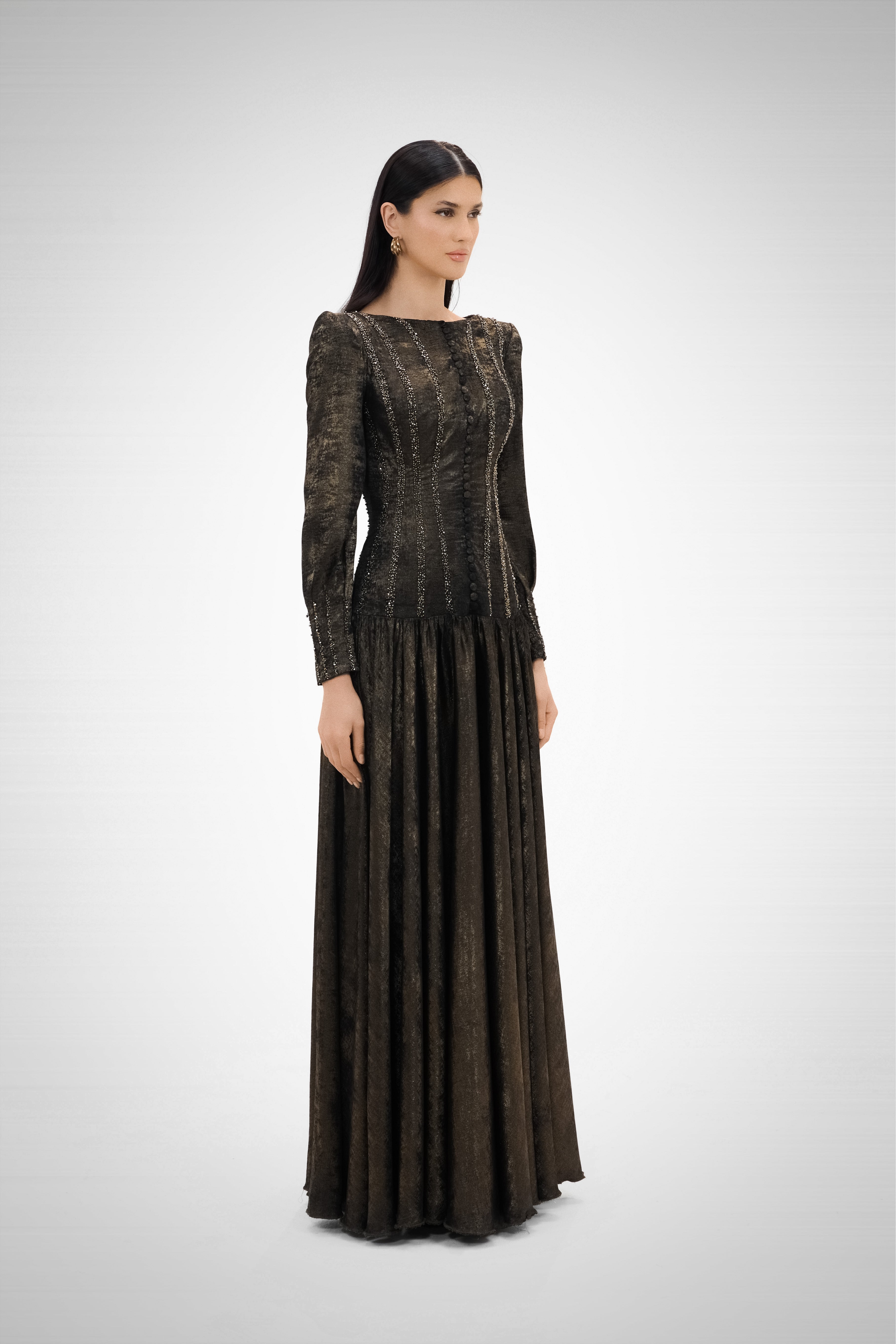 A celestial-inspired gown with flowing layers, The Eclipse captures the essence of movement and mystery, blending structure with fluid draping.