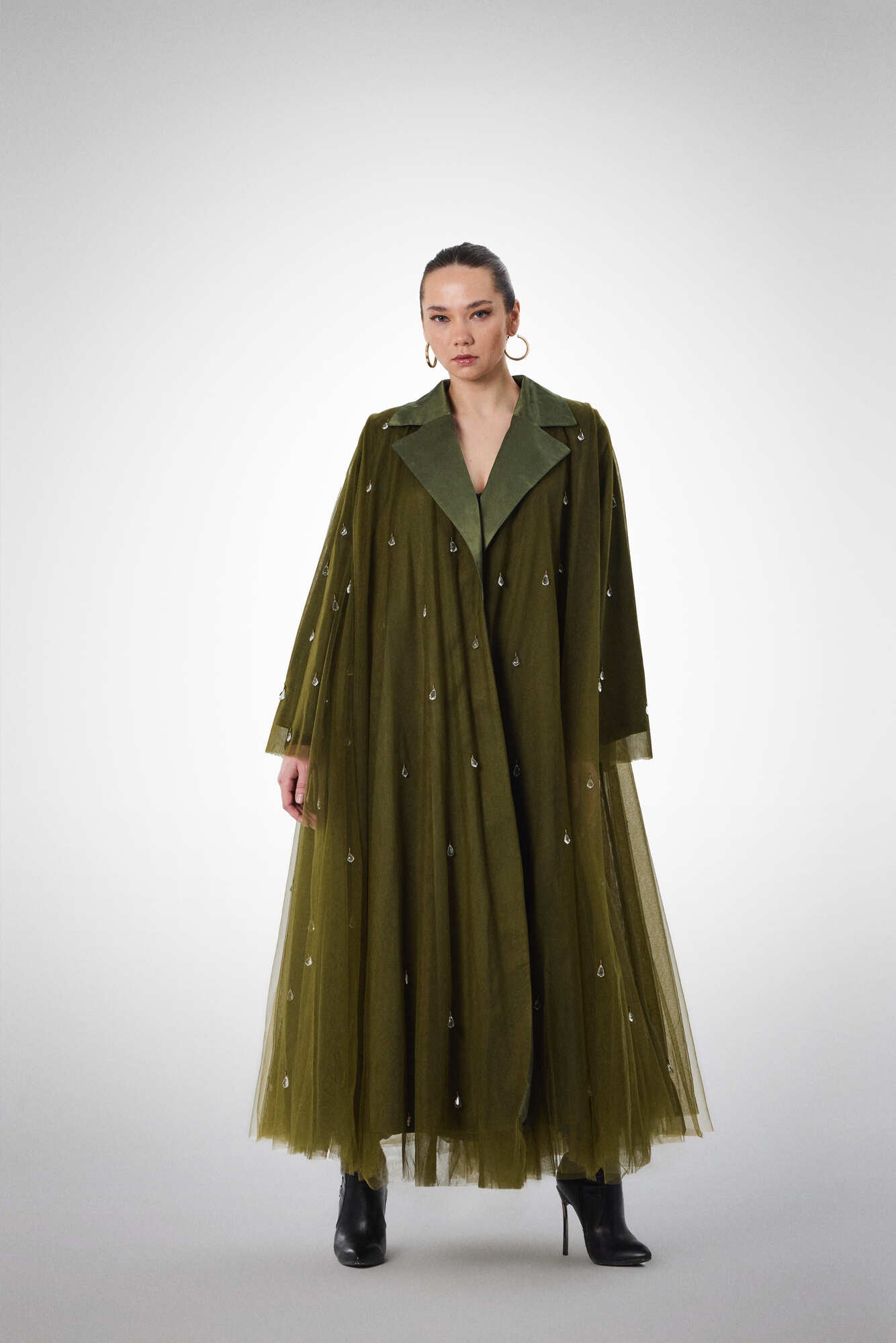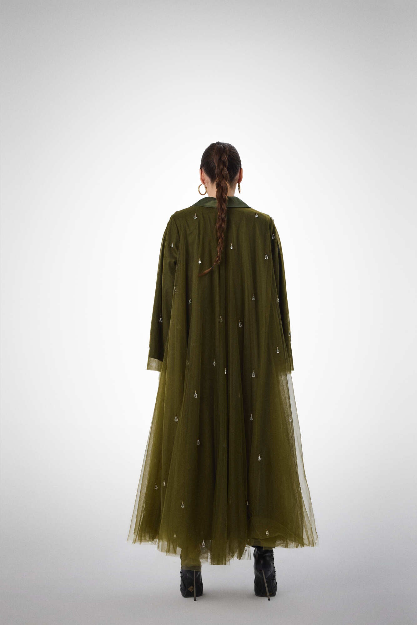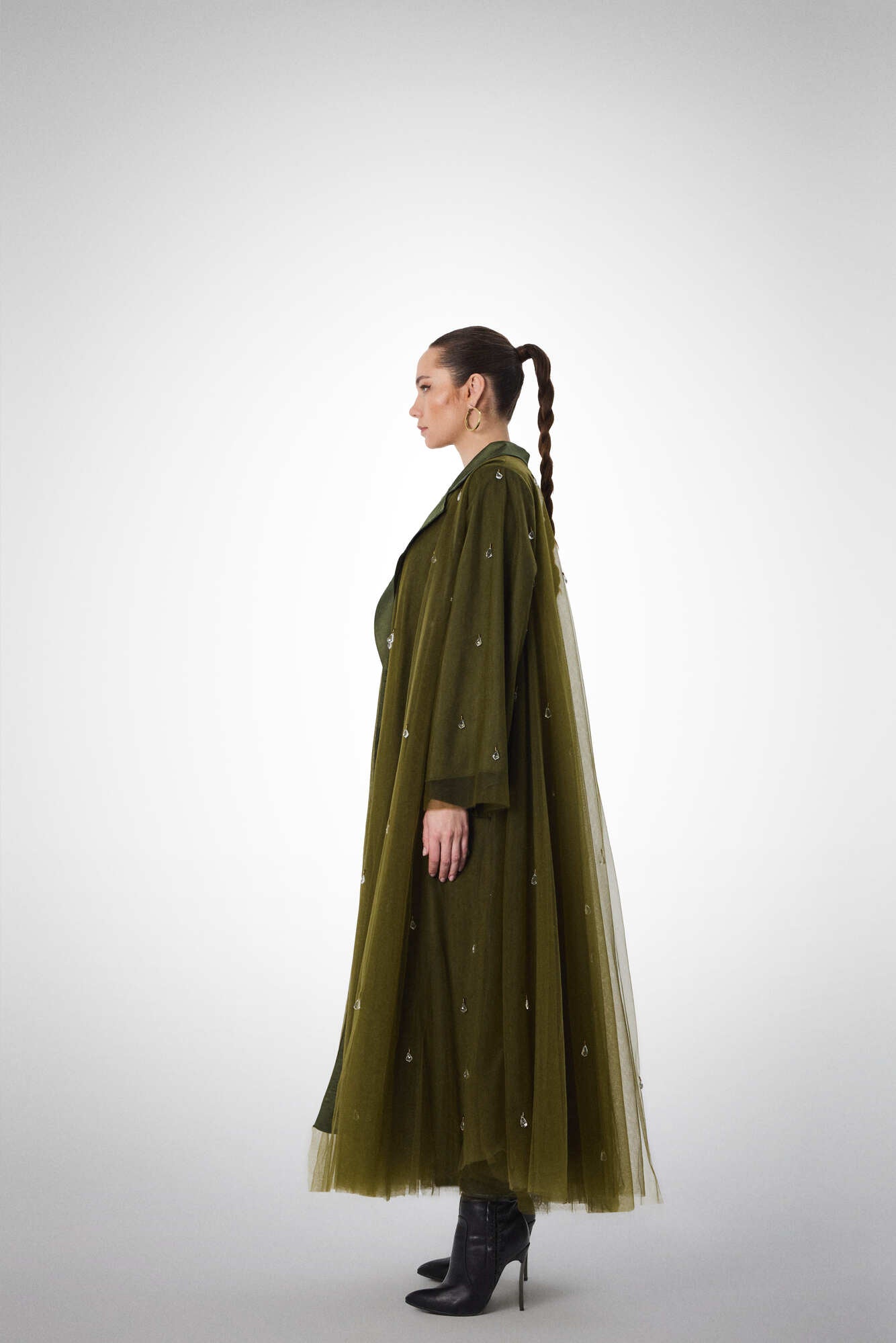A flowing olive green piece symbolizing renewal and harmony. Tulle layers with scattered crystals mimic water droplets, evoking clarity and grace.