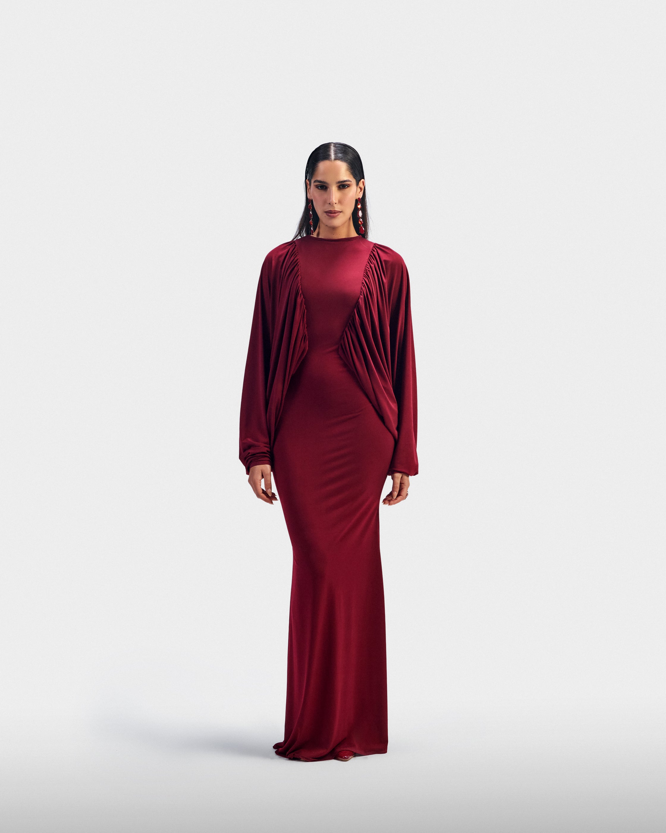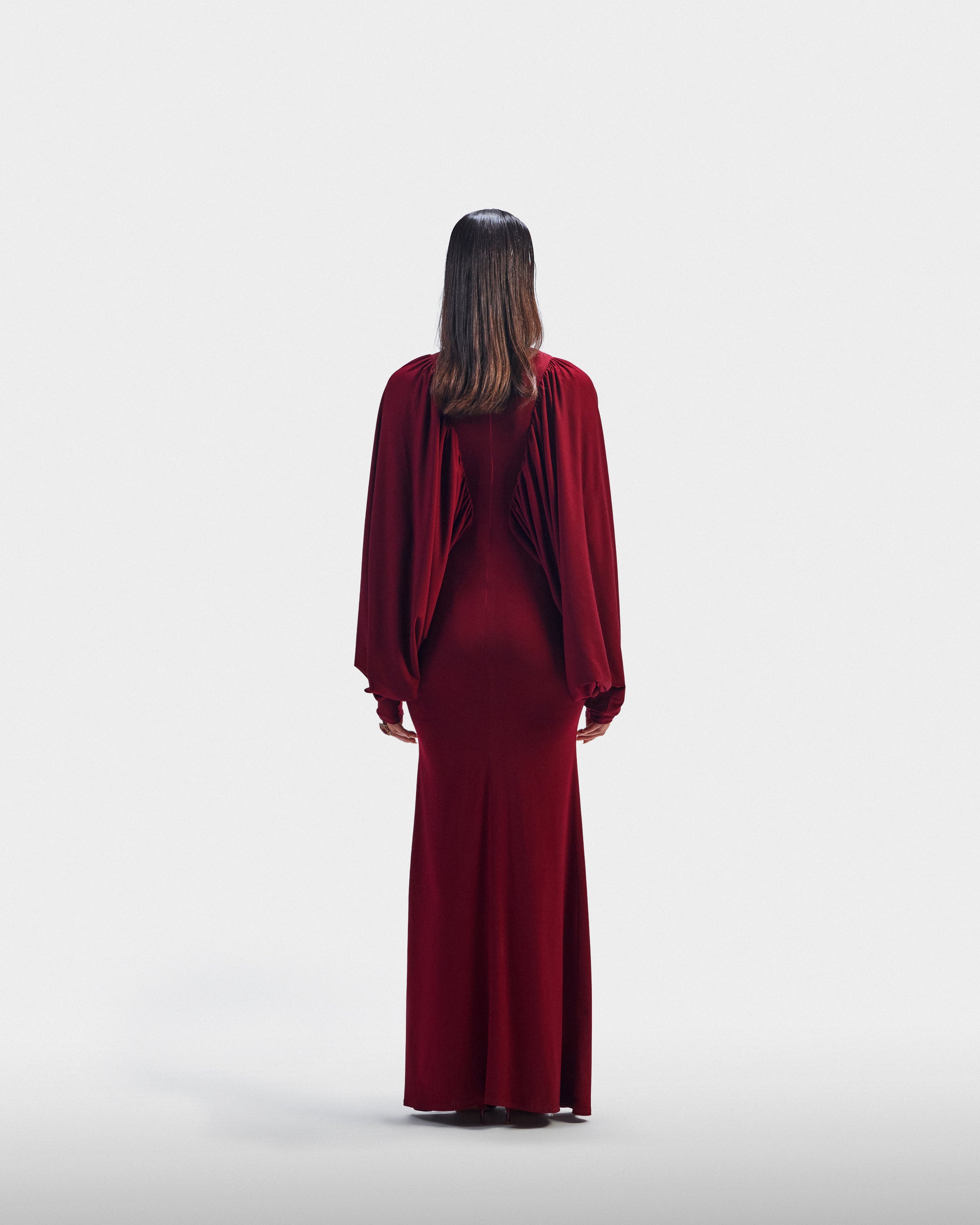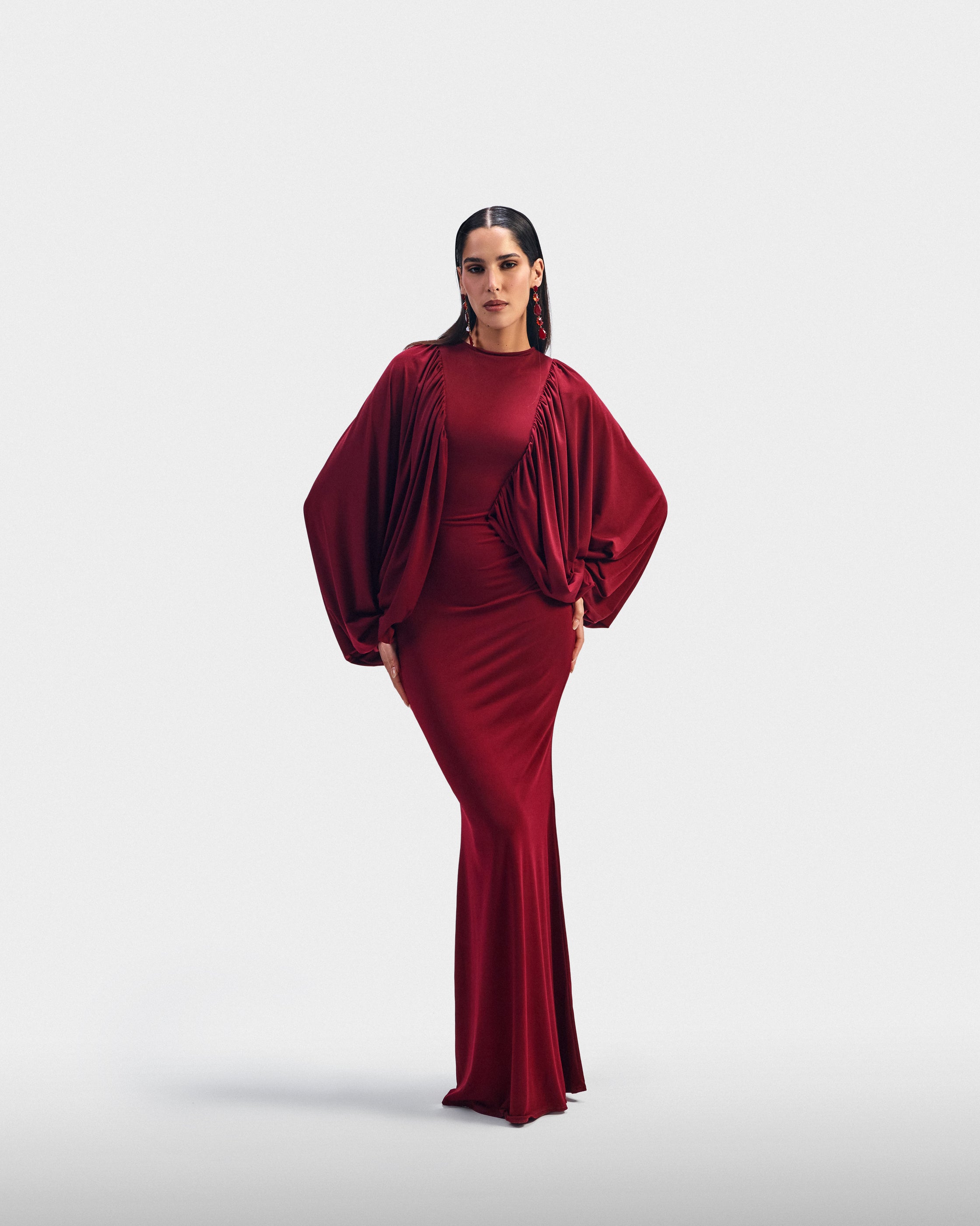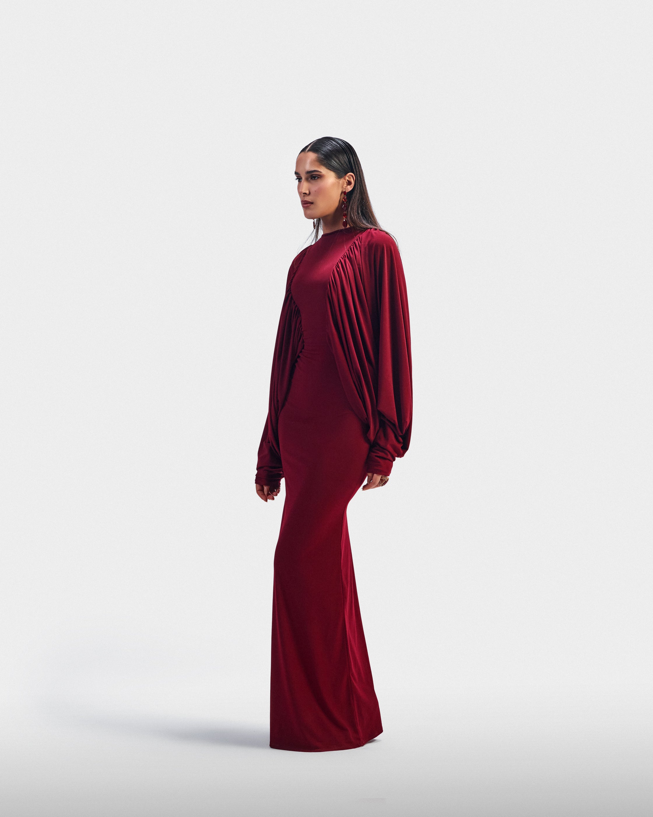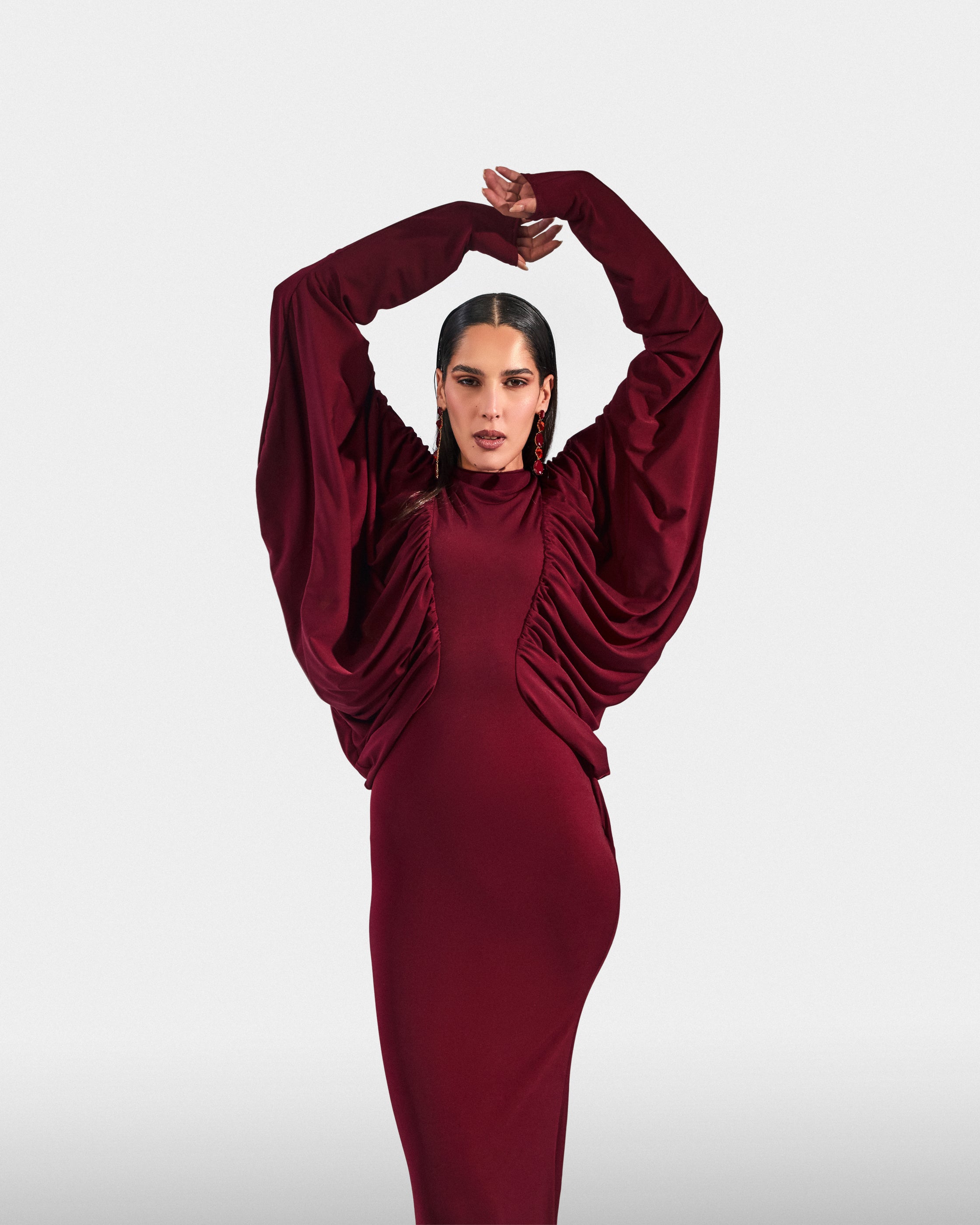 A fitted burgundy dress with voluminous balloon sleeves that balance structure and ease. Designed for confident evenings.