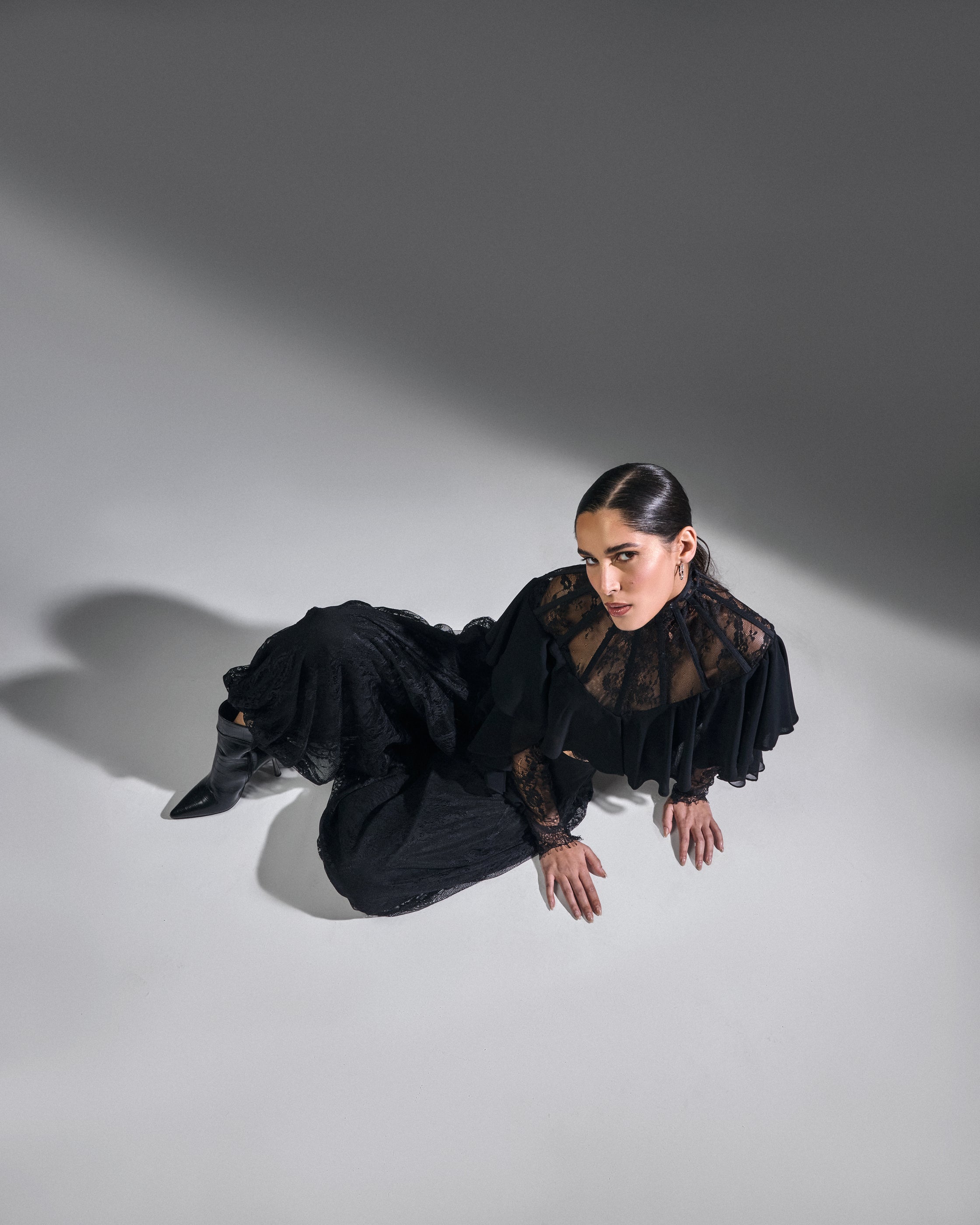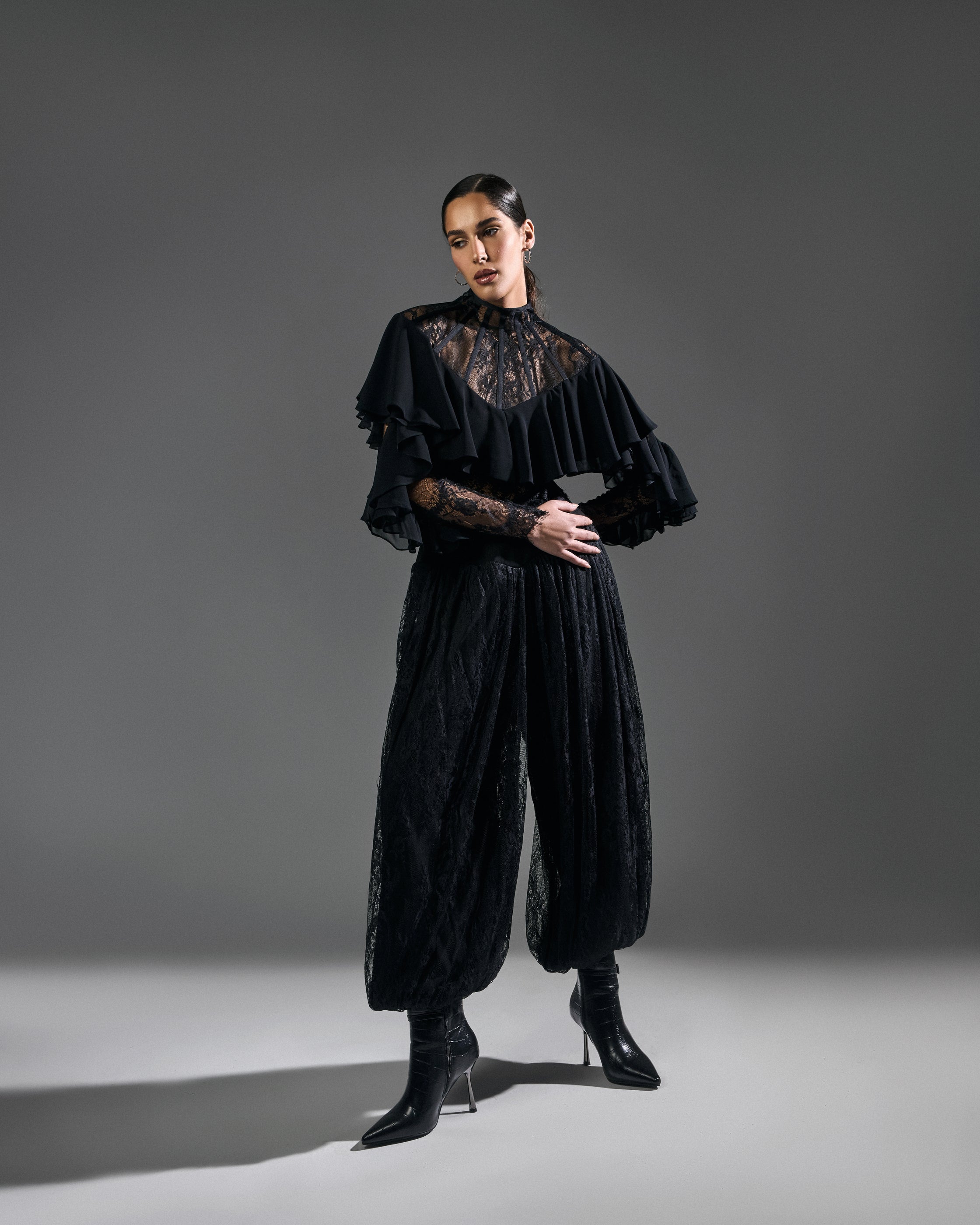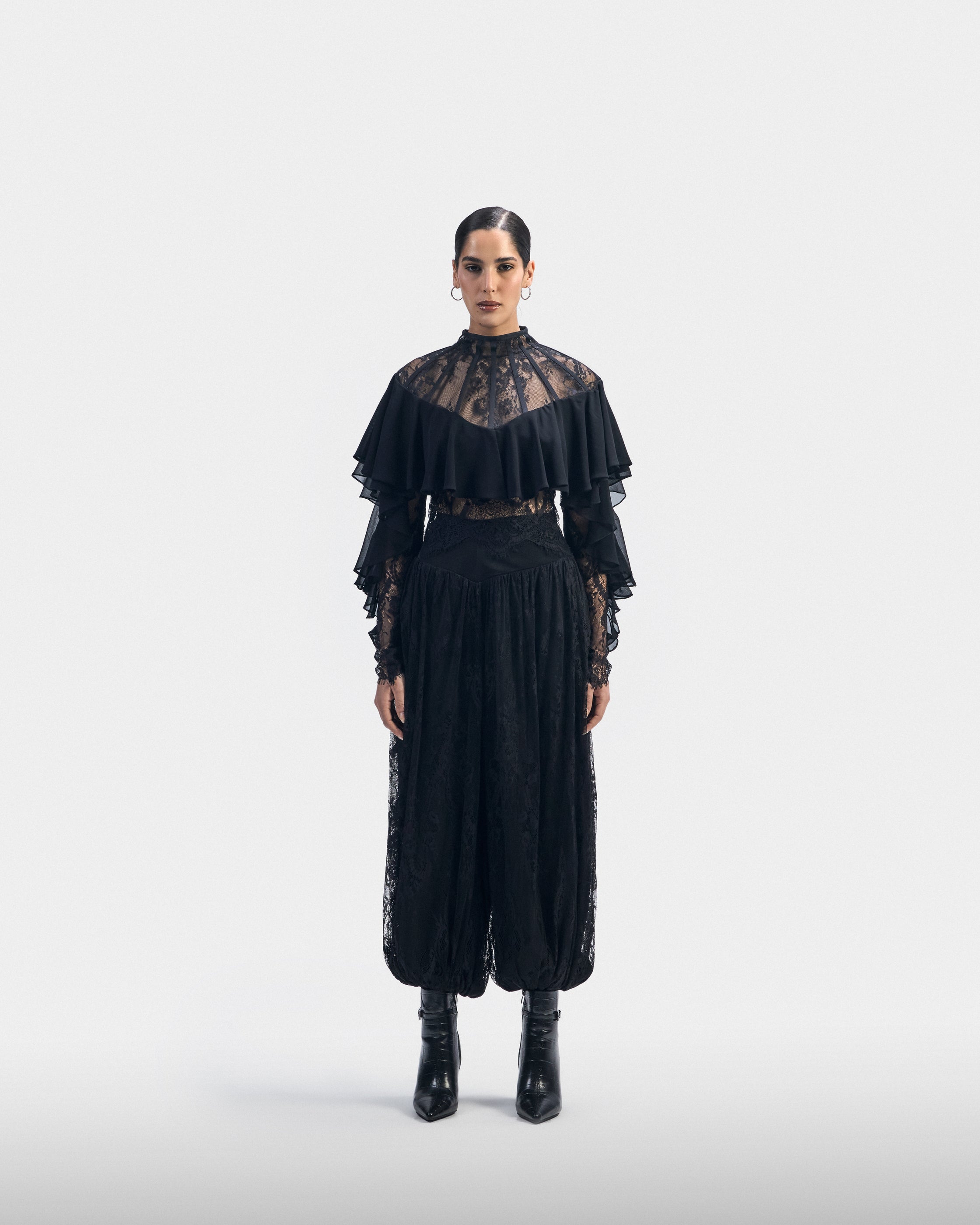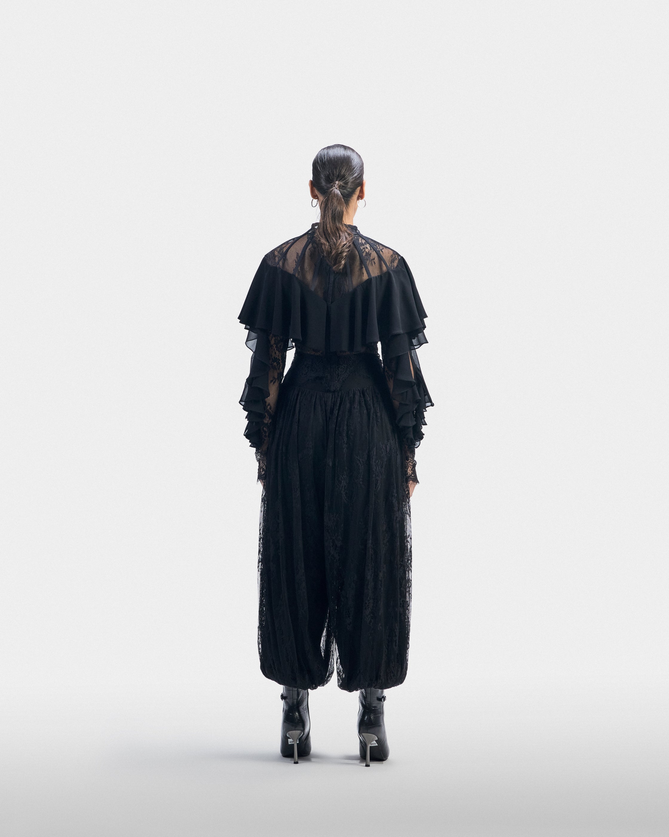 A delicate black lace set featuring fluid balloon pants. Softness, interpreted as intention — not fragility.