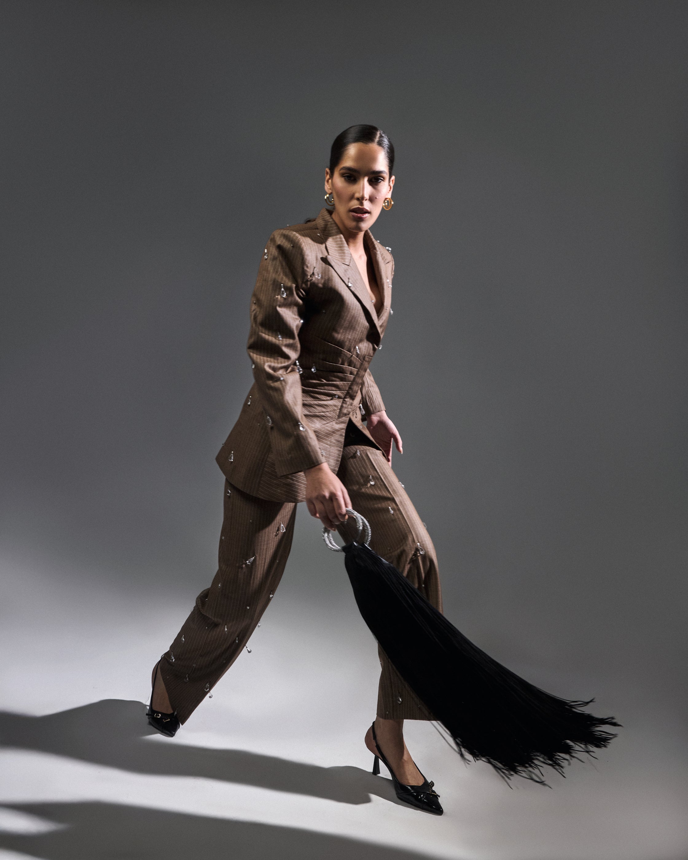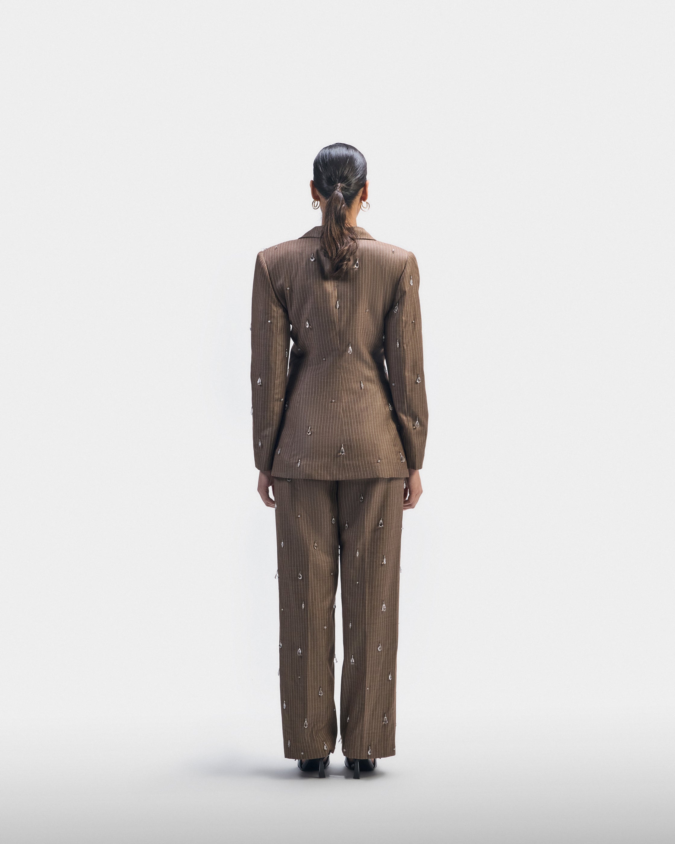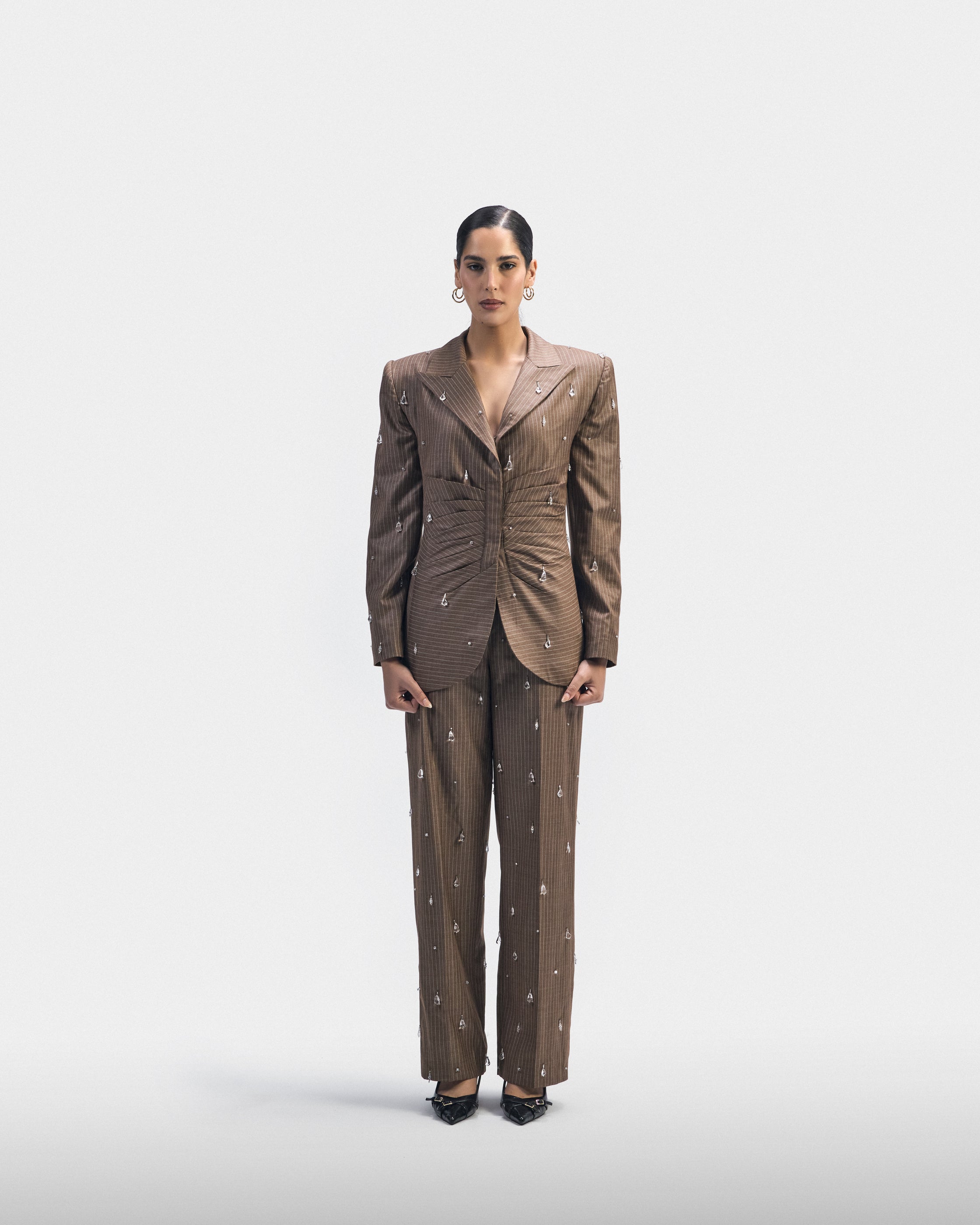 A tailored brown suit with soft pleating at the waist and subtle crystal detailing. Strength, built through structure and repetition.
