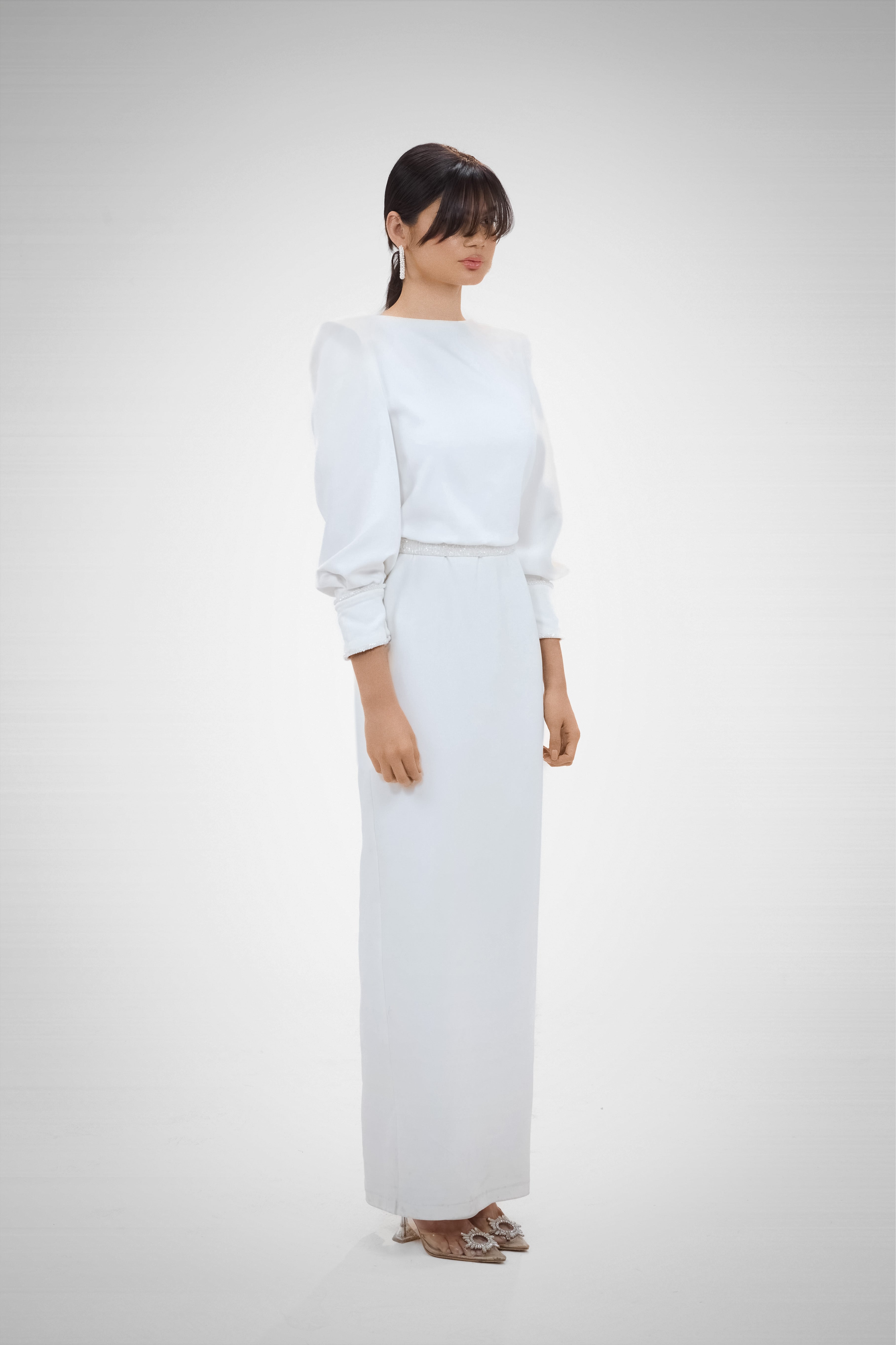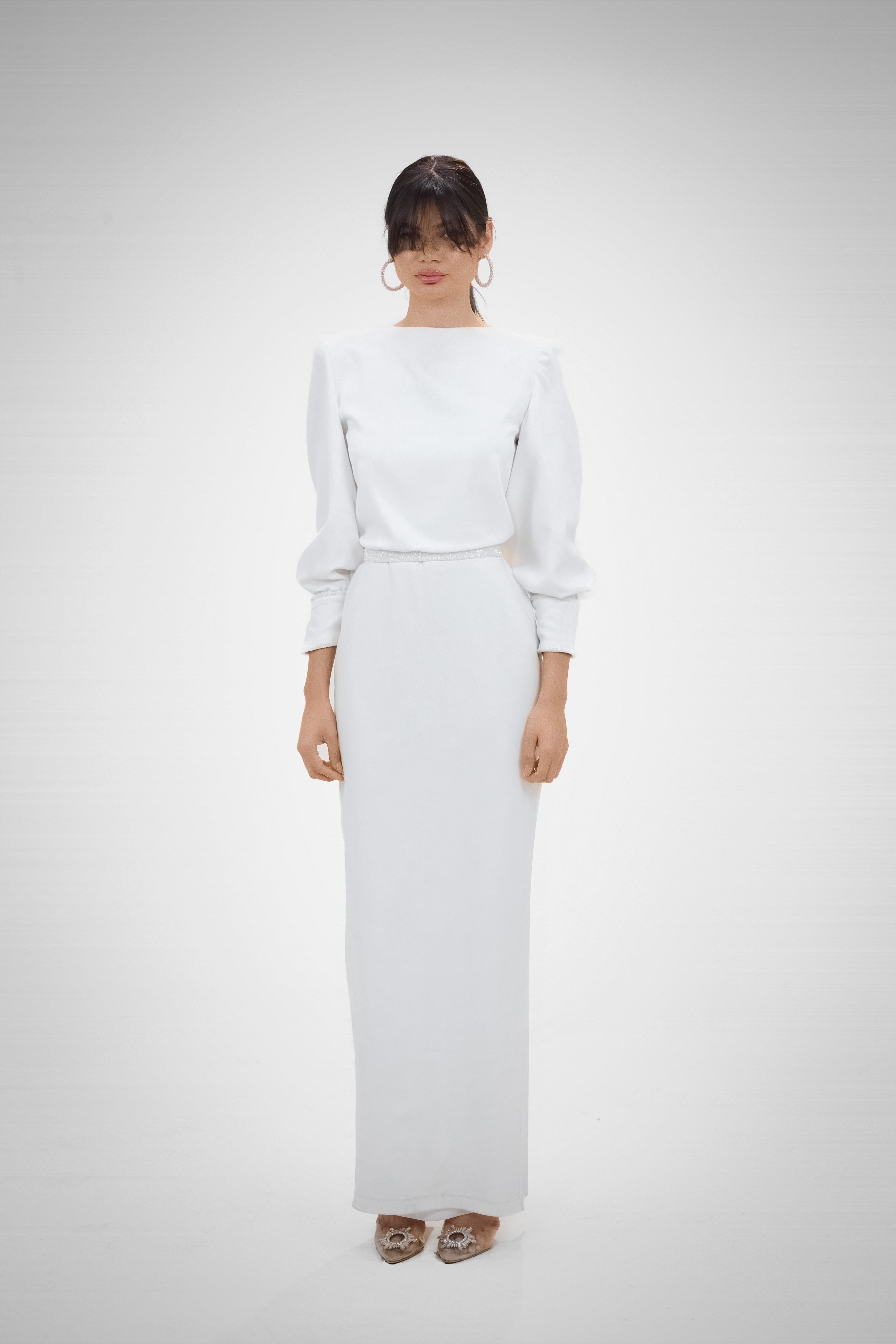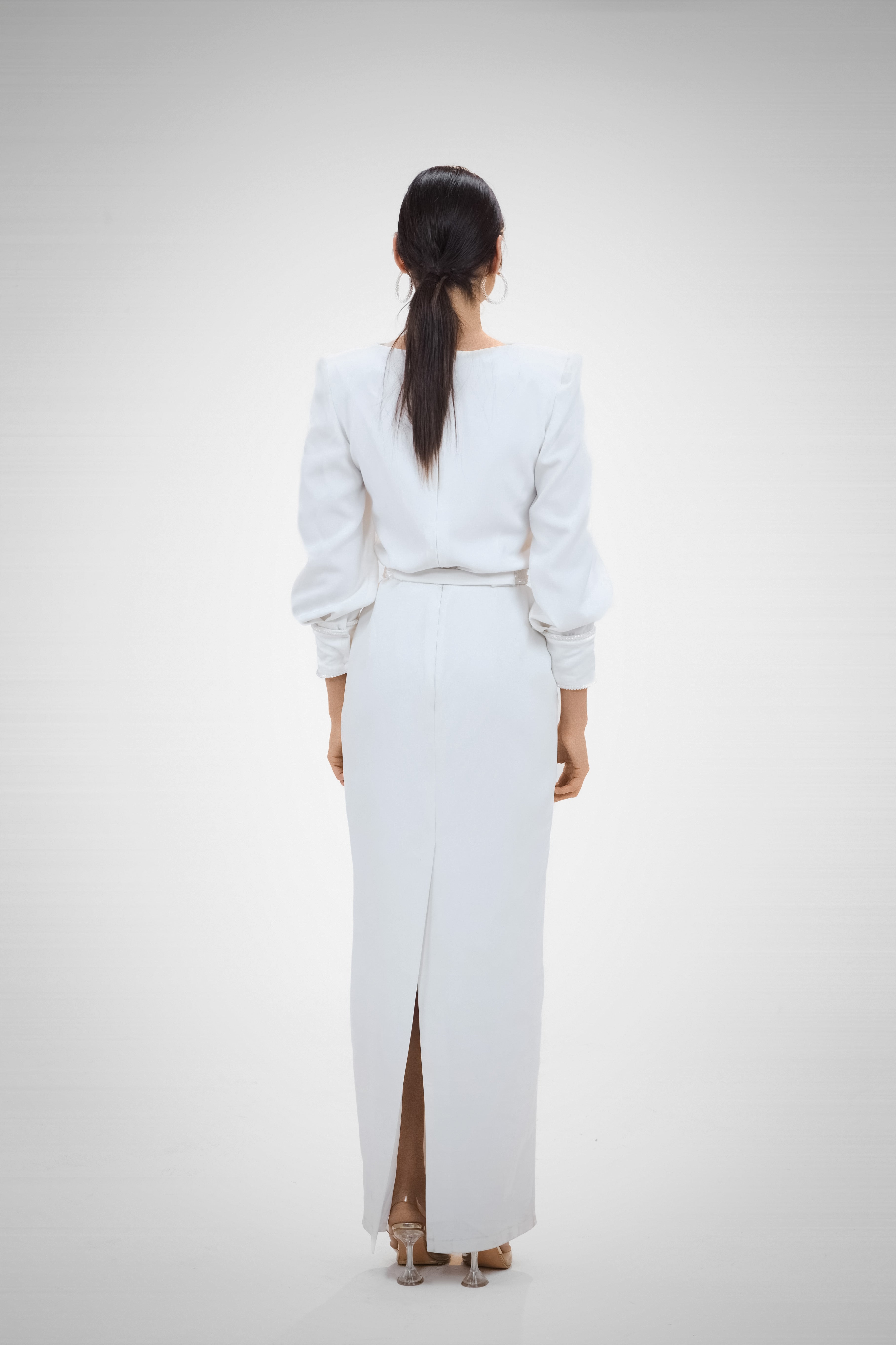 A luminous white dress with structured shoulders, designed to radiate confidence and grace, embodying inner strength through elegant design.