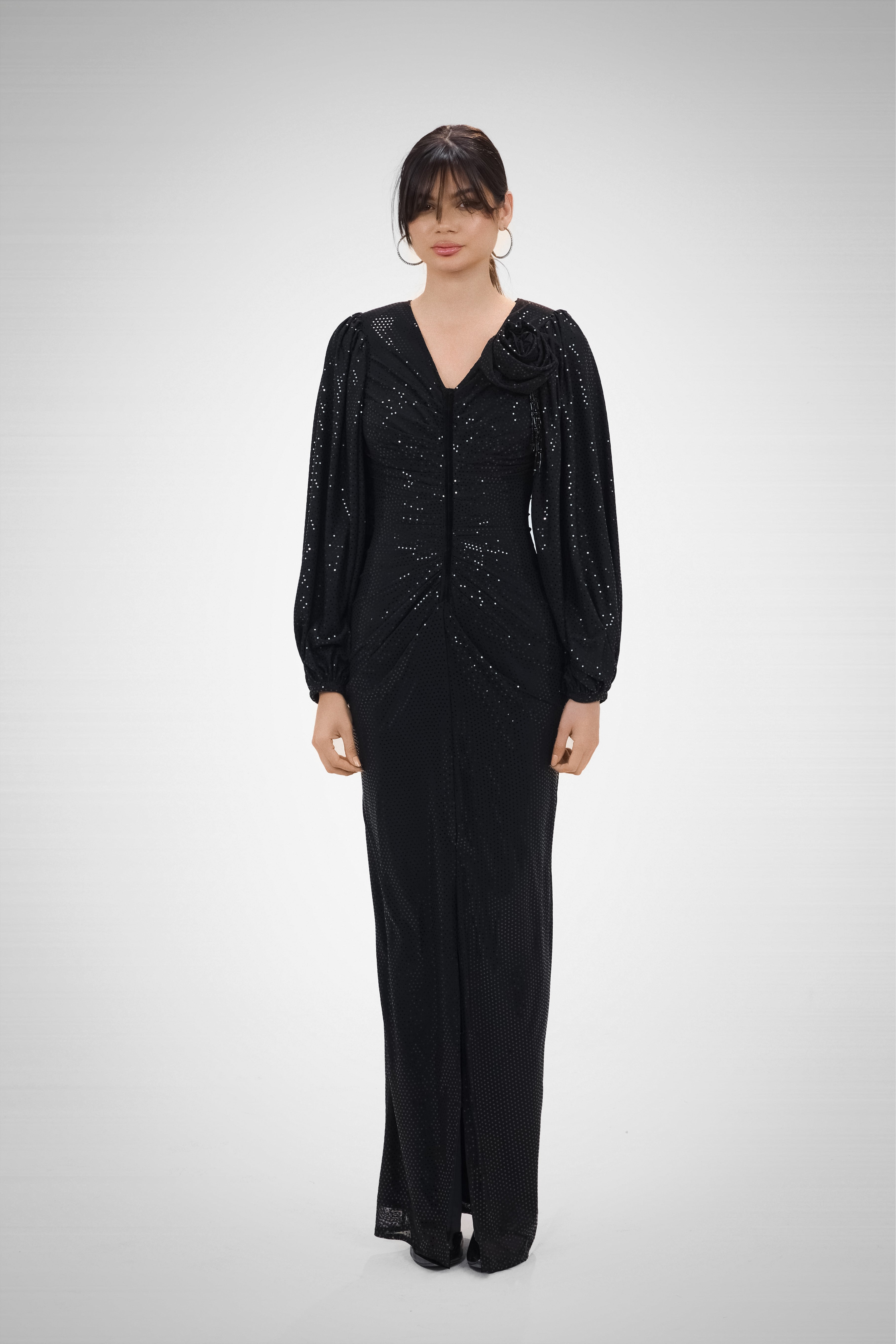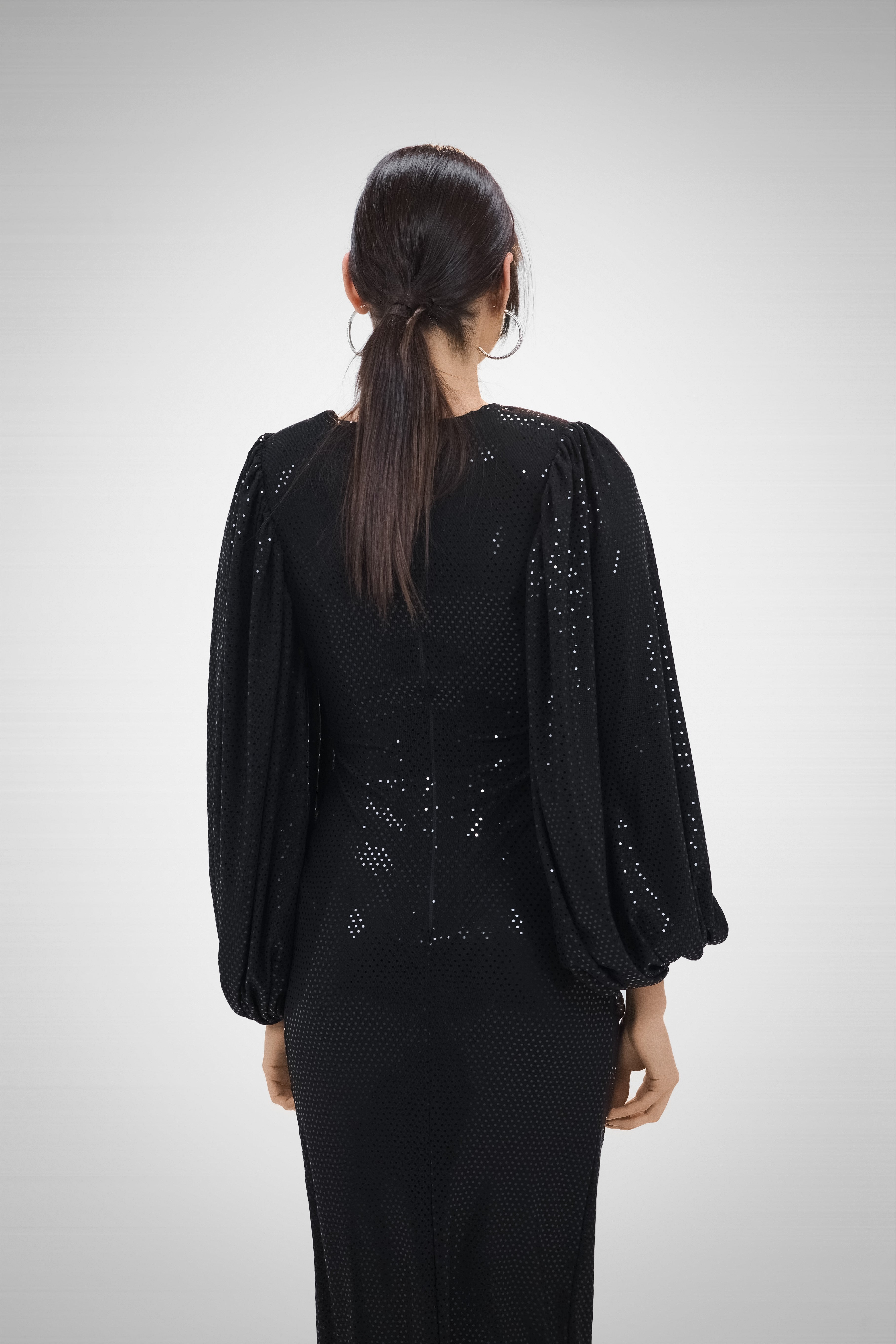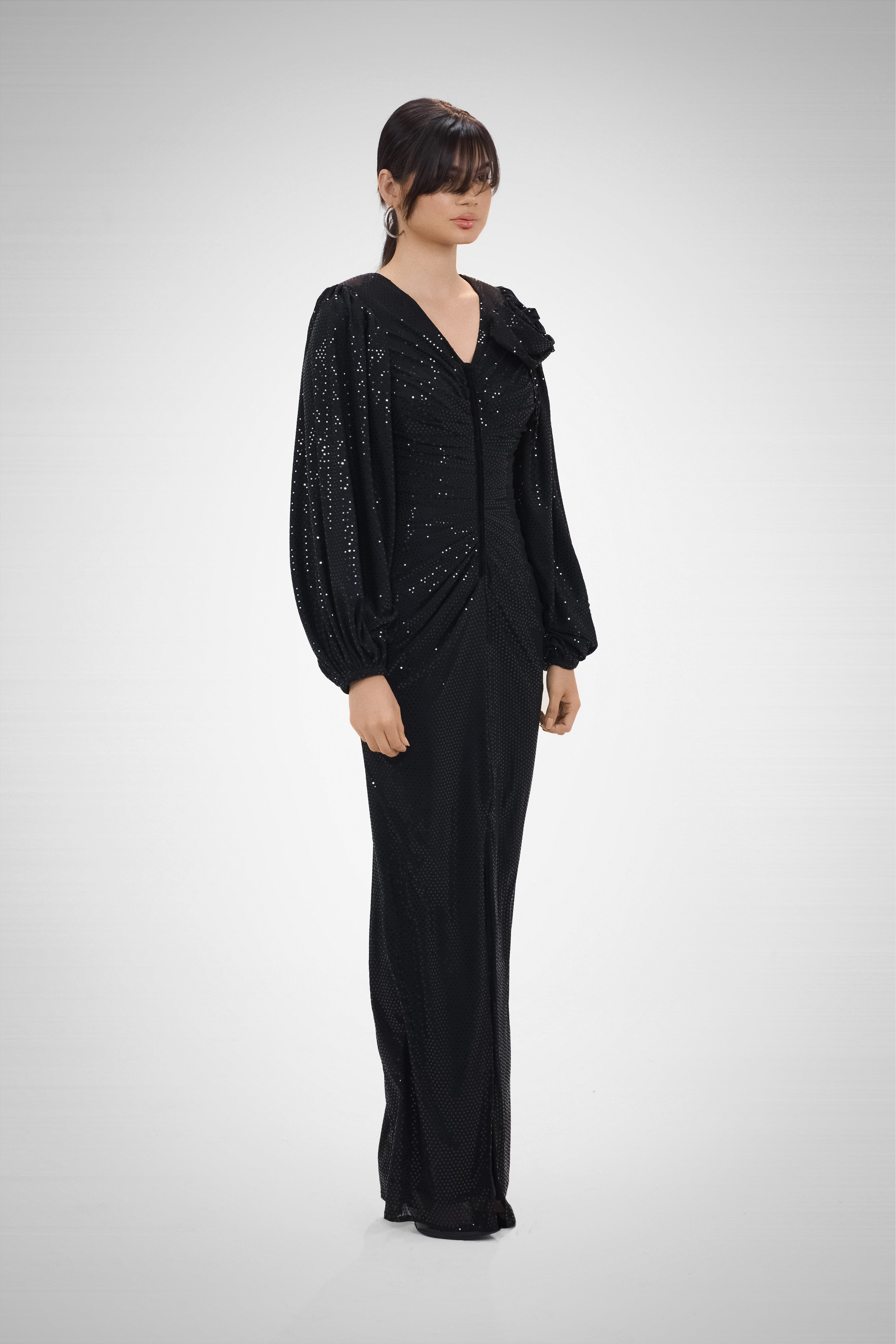 A black draped dress with puffy sleeves and shimmering details, embodying mystery, depth, and a touch of celestial elegance.