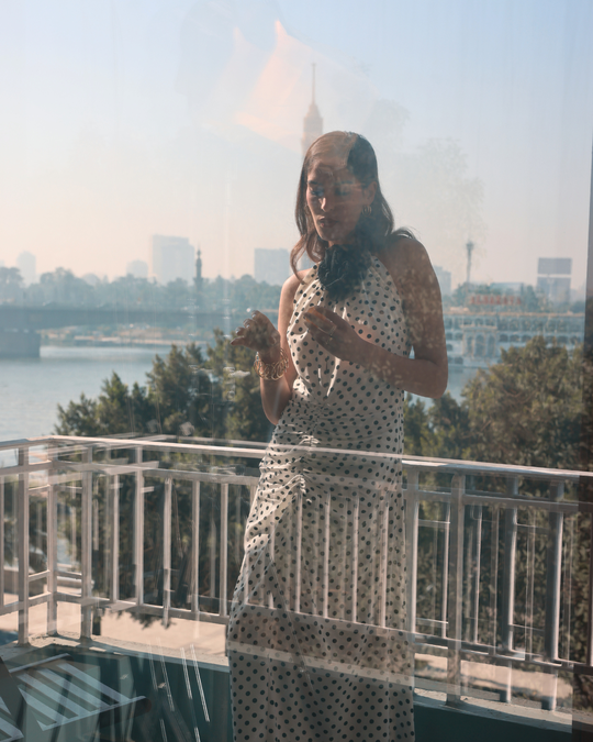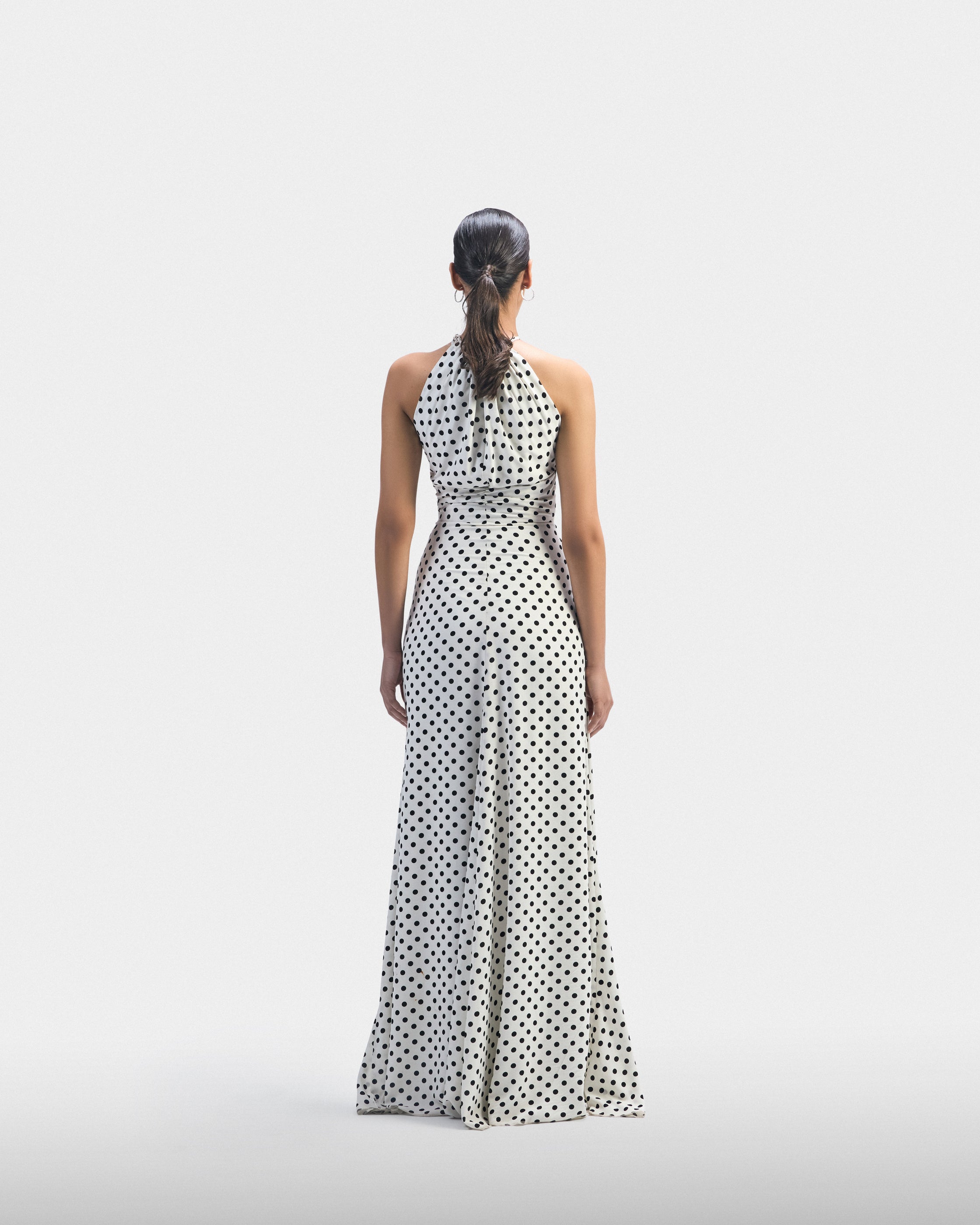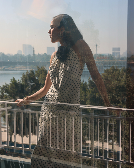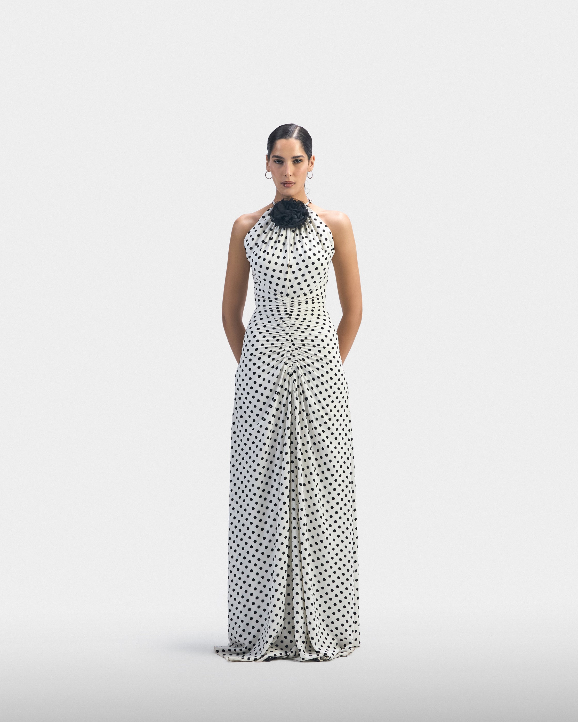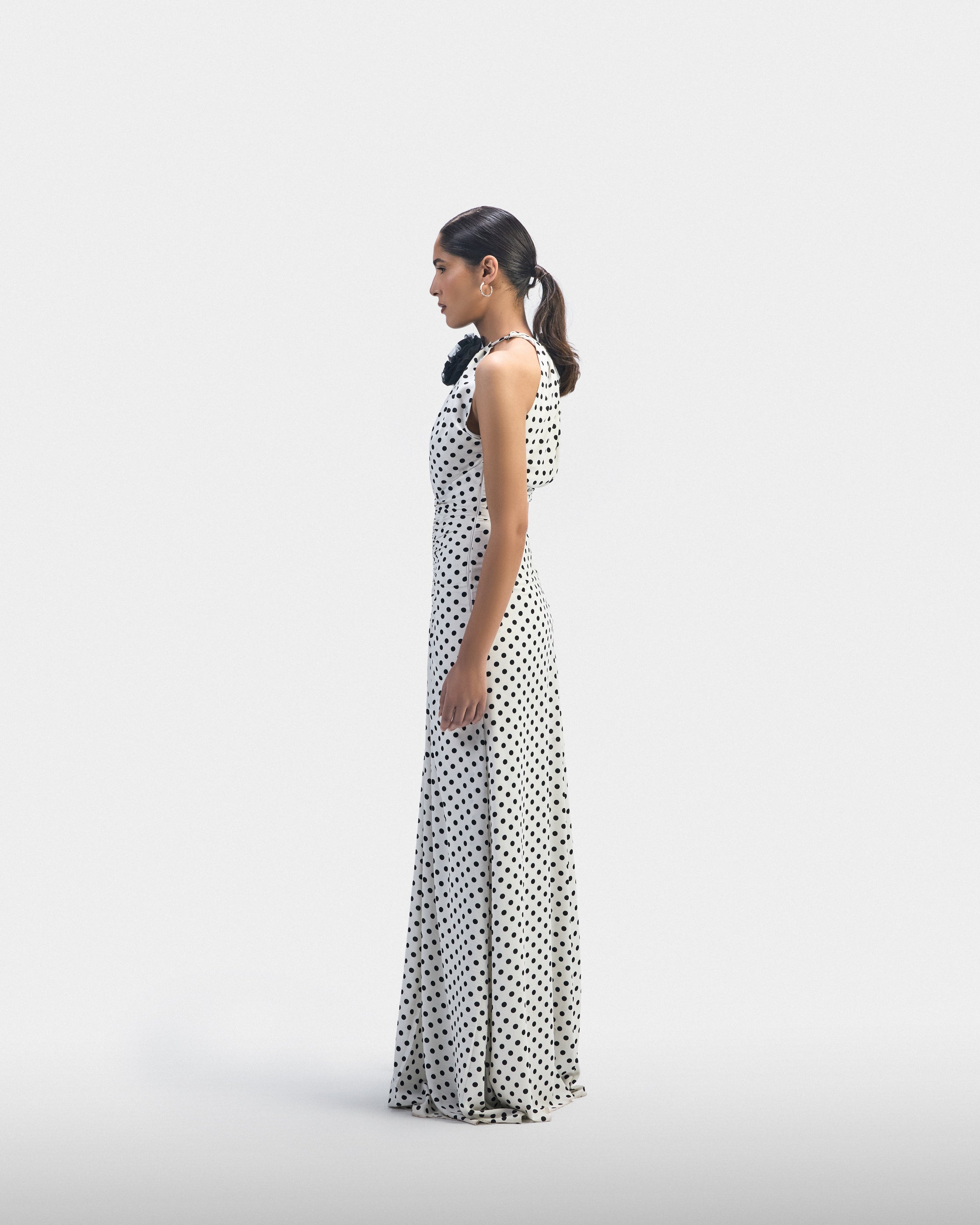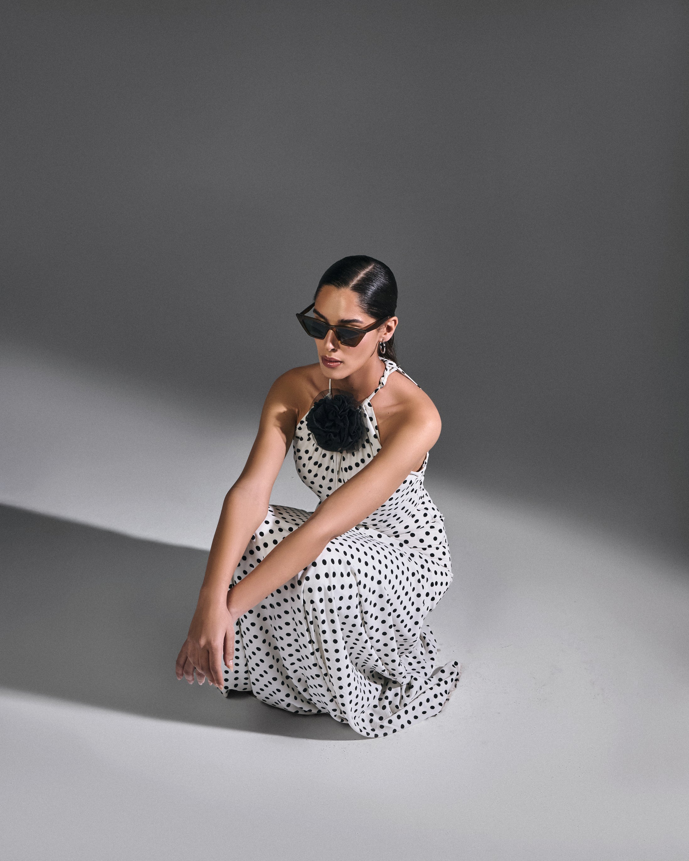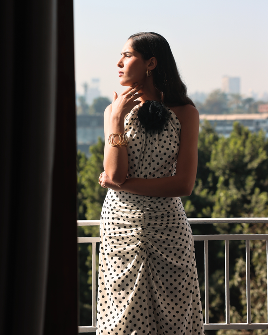 A white polka dot dress accented with a black floral detail. Designed to exist fully in the moment — uncomplicated and aware.