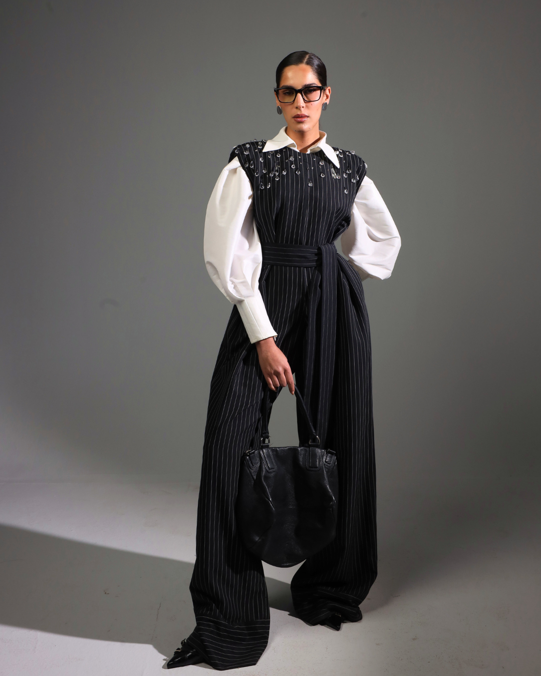 A tailored black striped piece with padded shoulders and subtle crystal details. Built for structure, movement, and continuity.