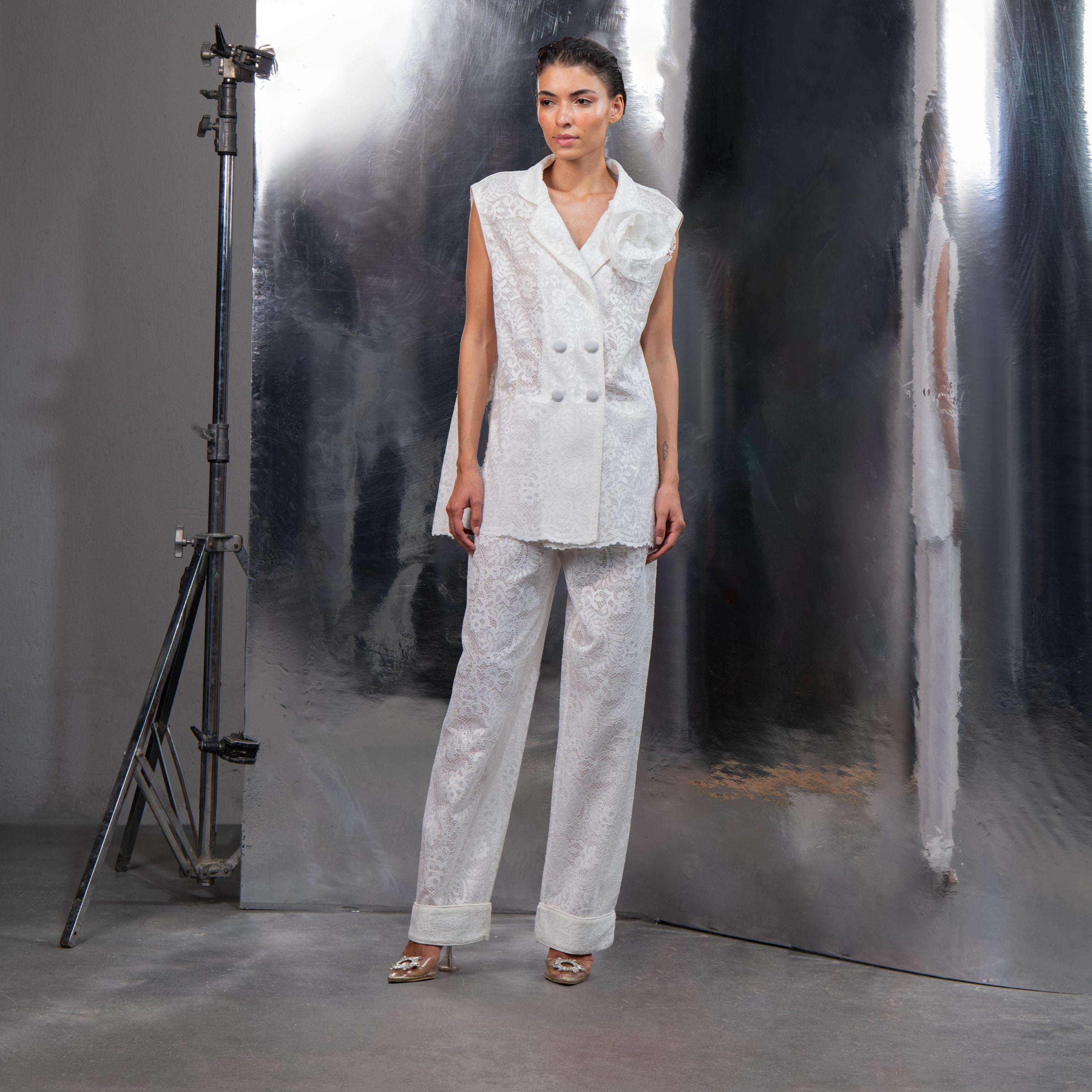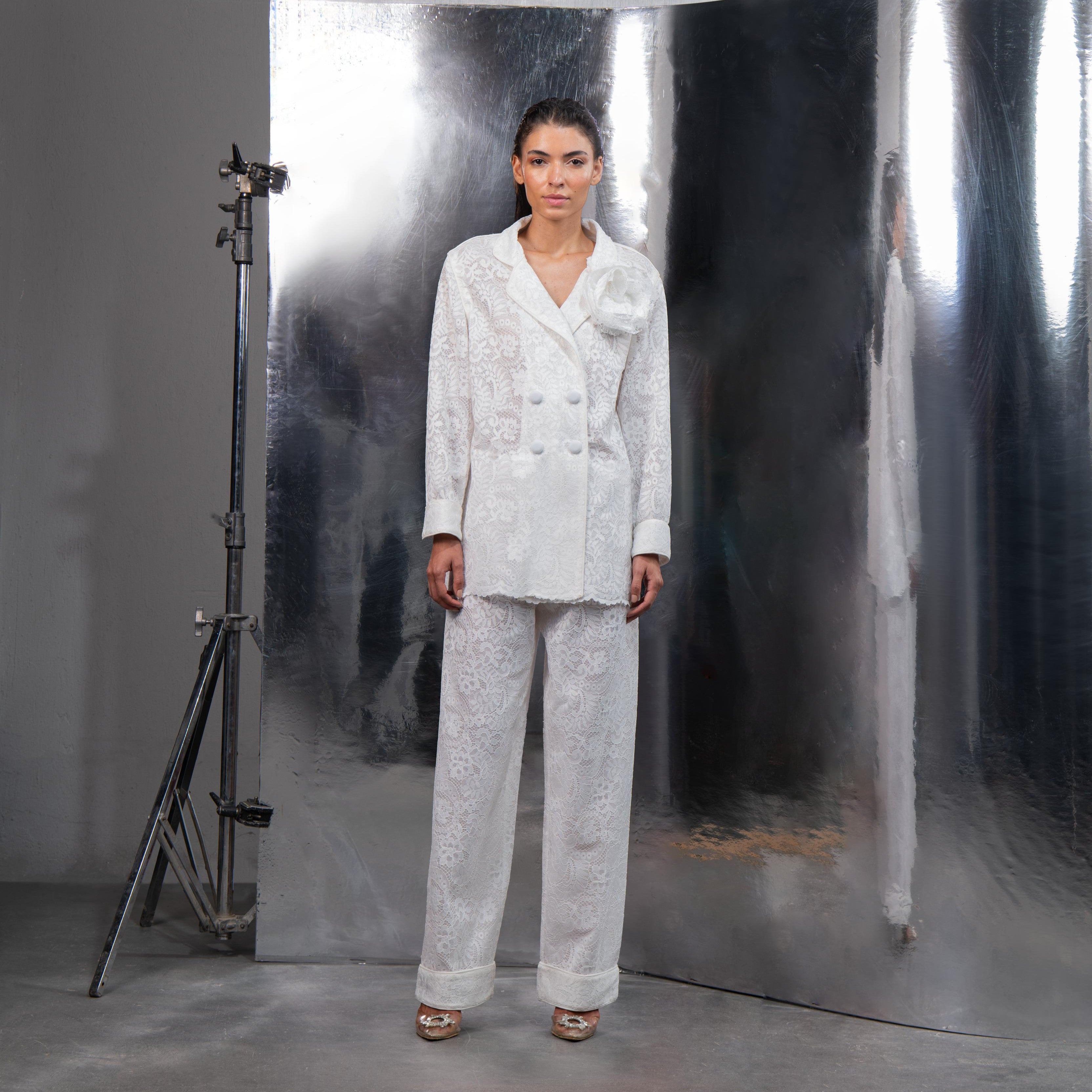 A modern lace double buttoned jacket with detachable sleeves and an add on flower for more versatility in white.