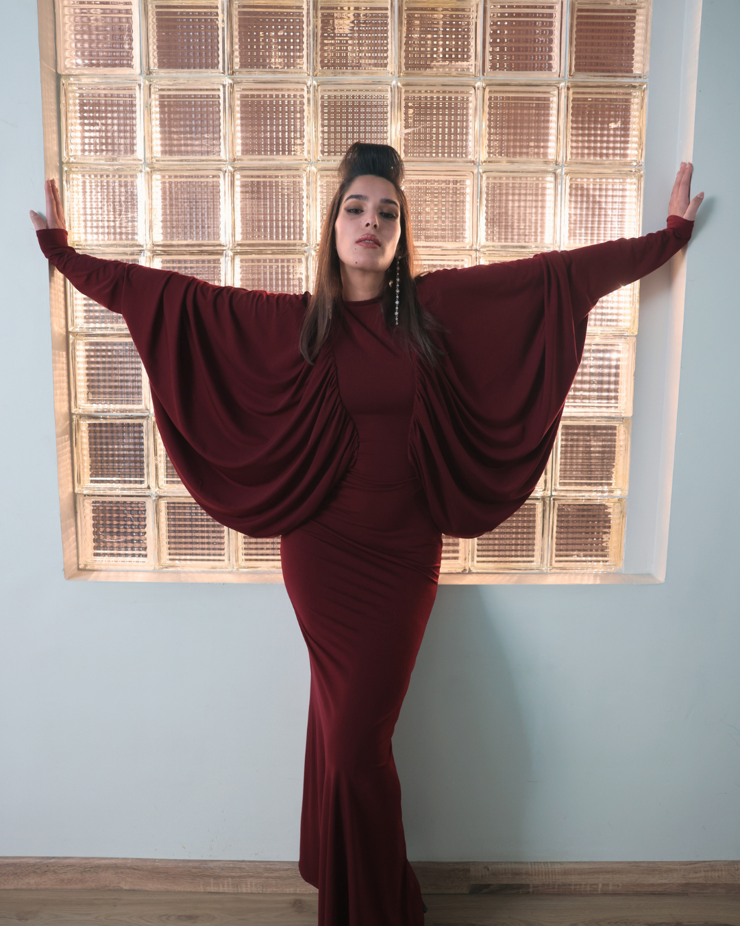 A fitted burgundy dress with voluminous balloon sleeves that balance structure and ease. Designed for confident evenings.