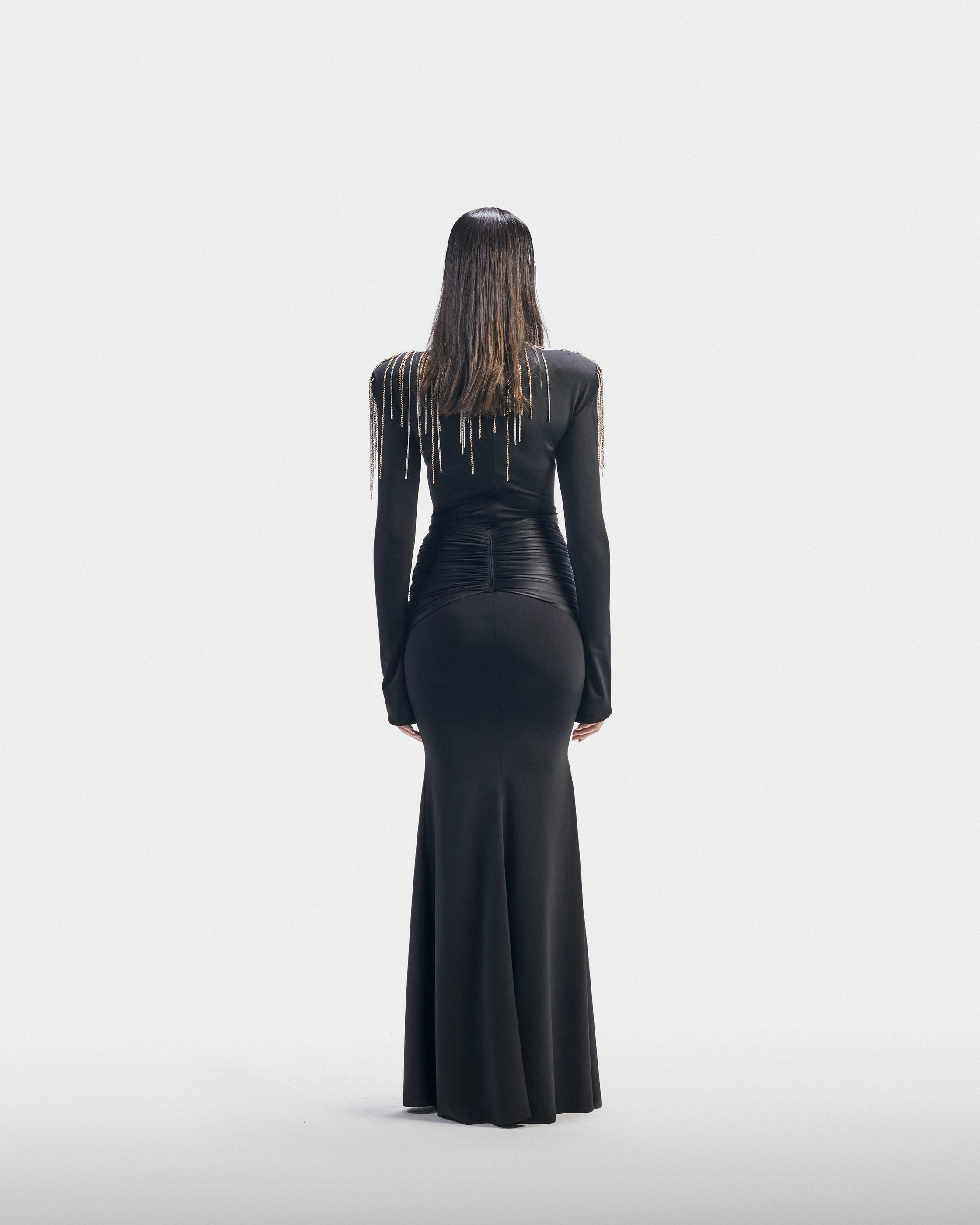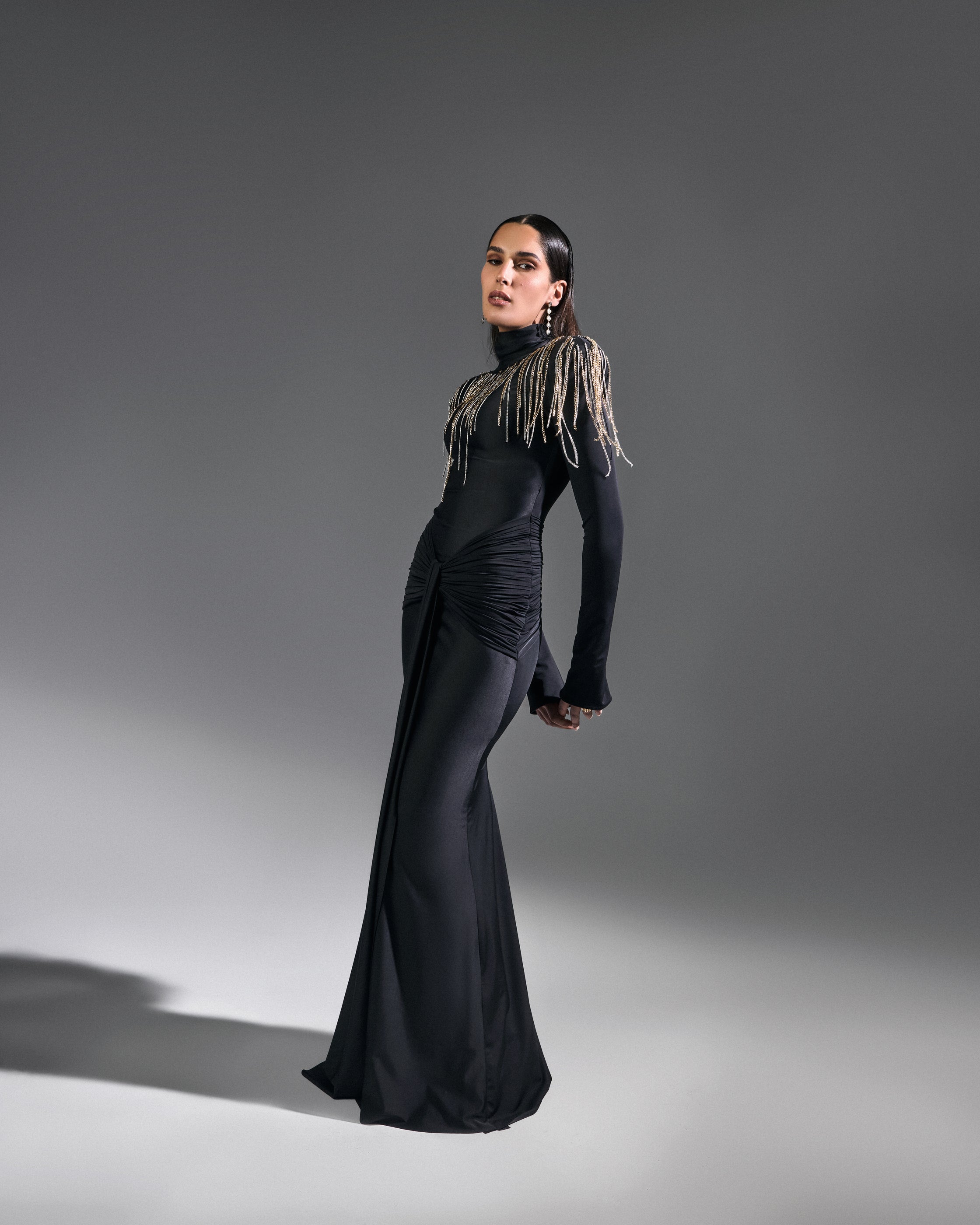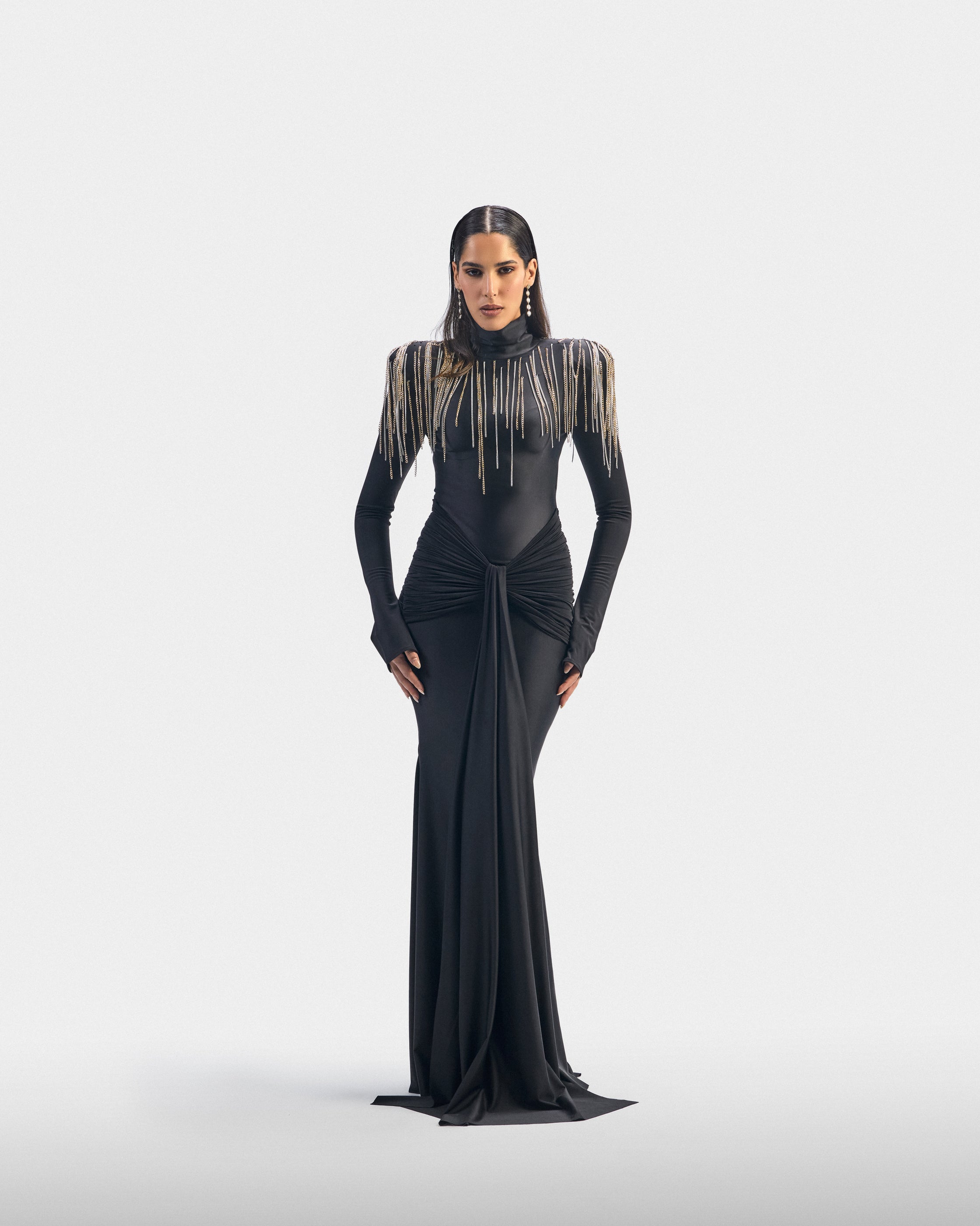 A high neck, sculpted black gown defined by cascading metallic chains that create a rhythmic, waterfall effect. Built for a presence that is grounded, linear, and unapologetically bold.