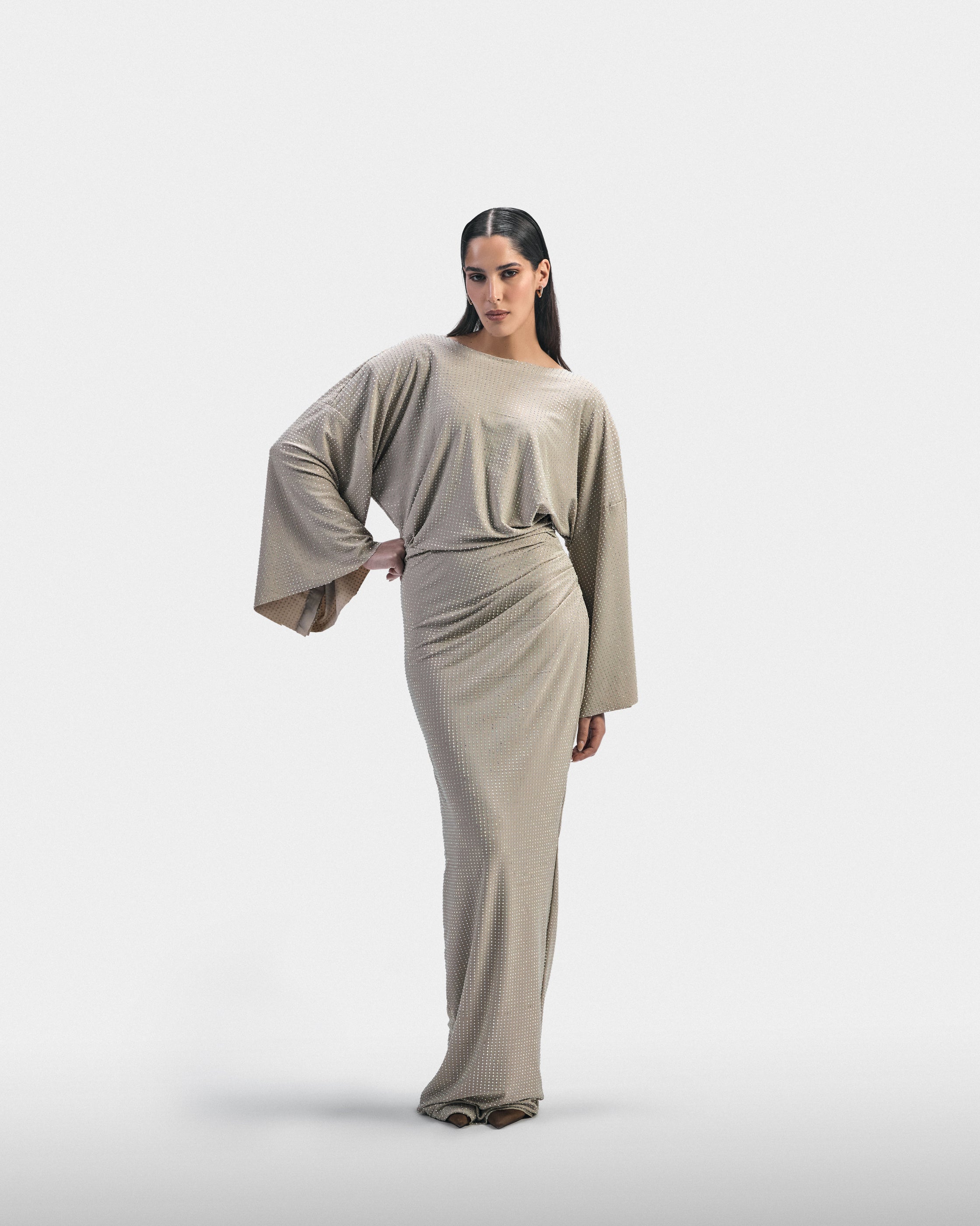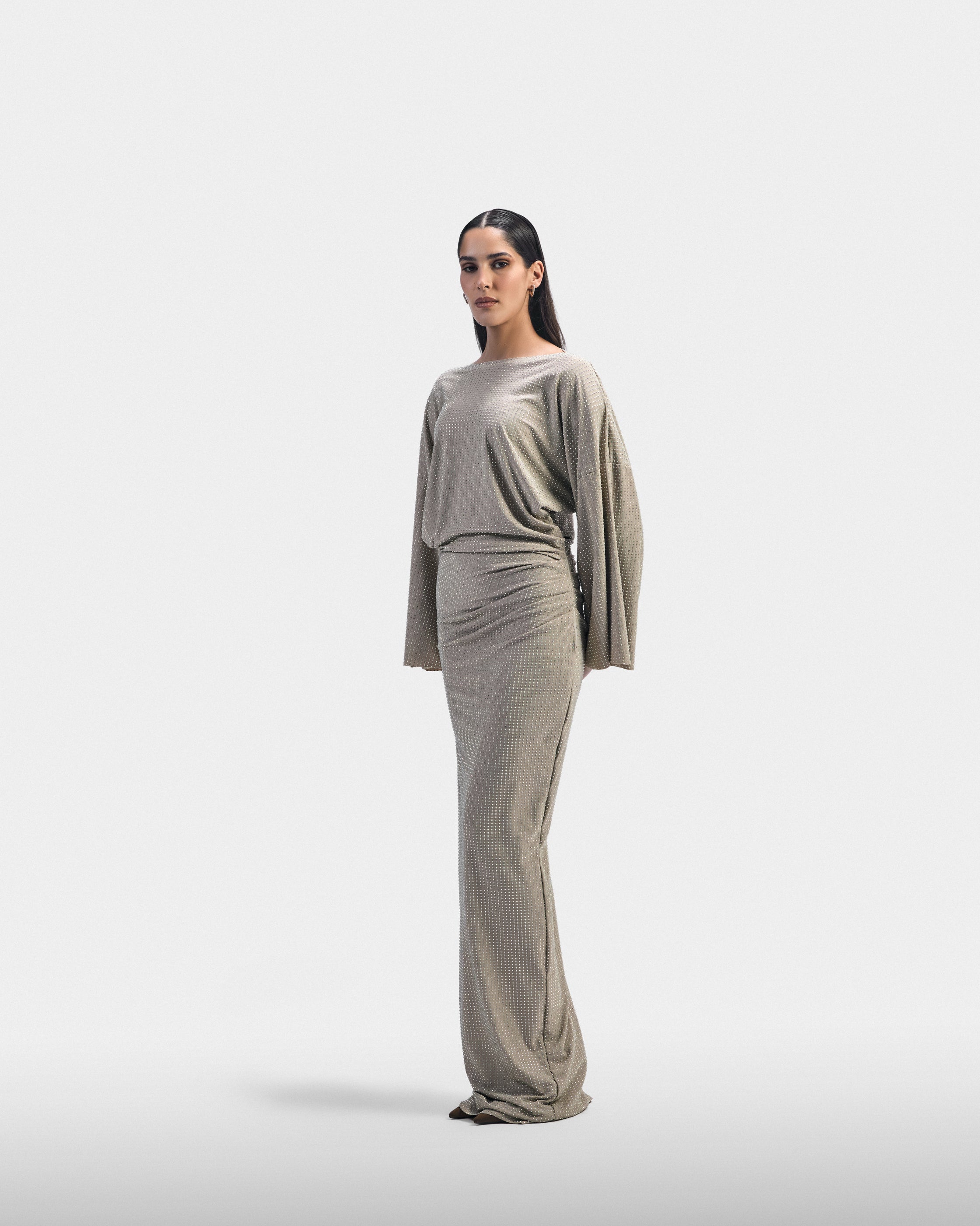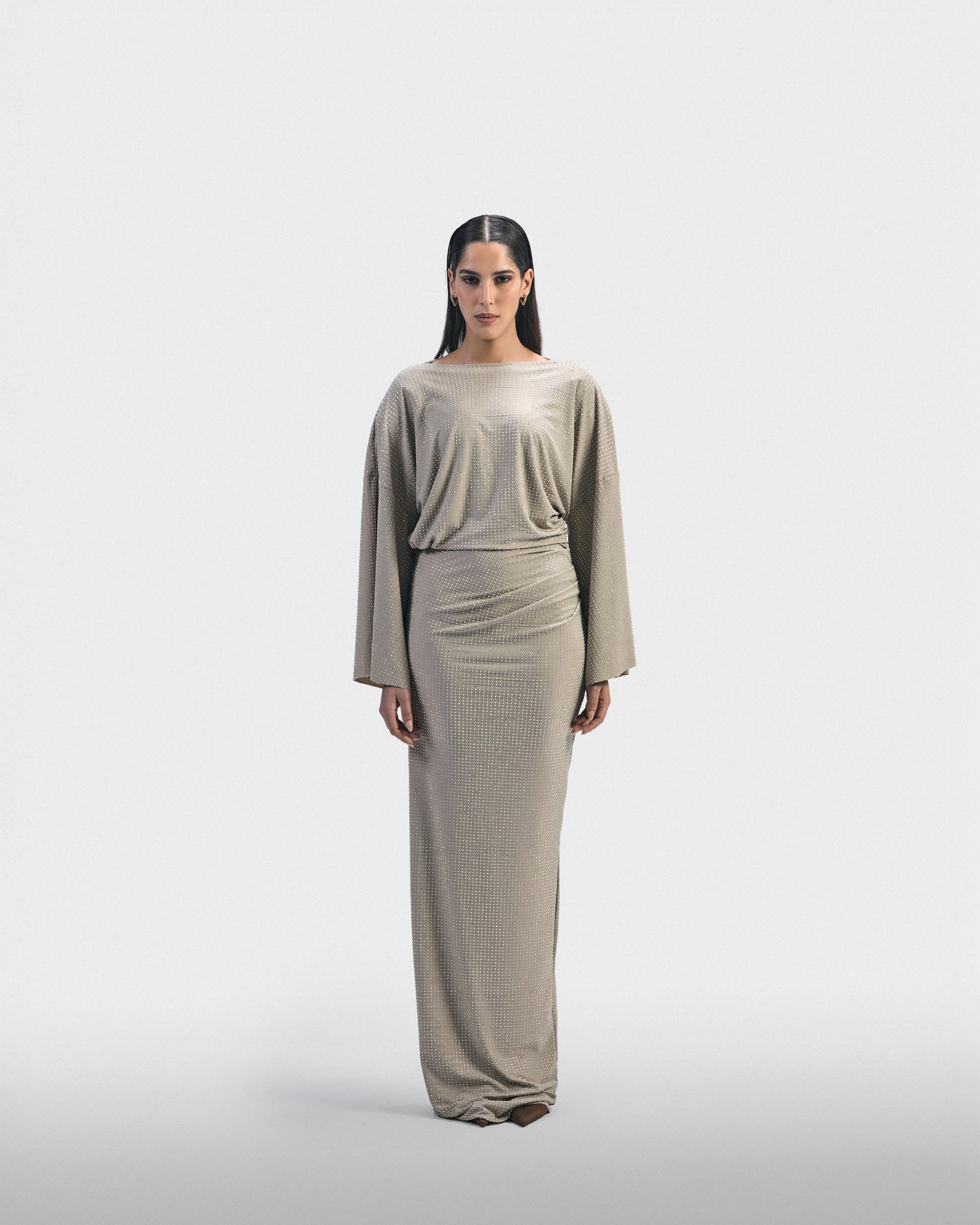 A streamlined, floor length dress fully adorned in shimmering champagne sequins with a boat neckline and dramatic, wide cut sleeves.