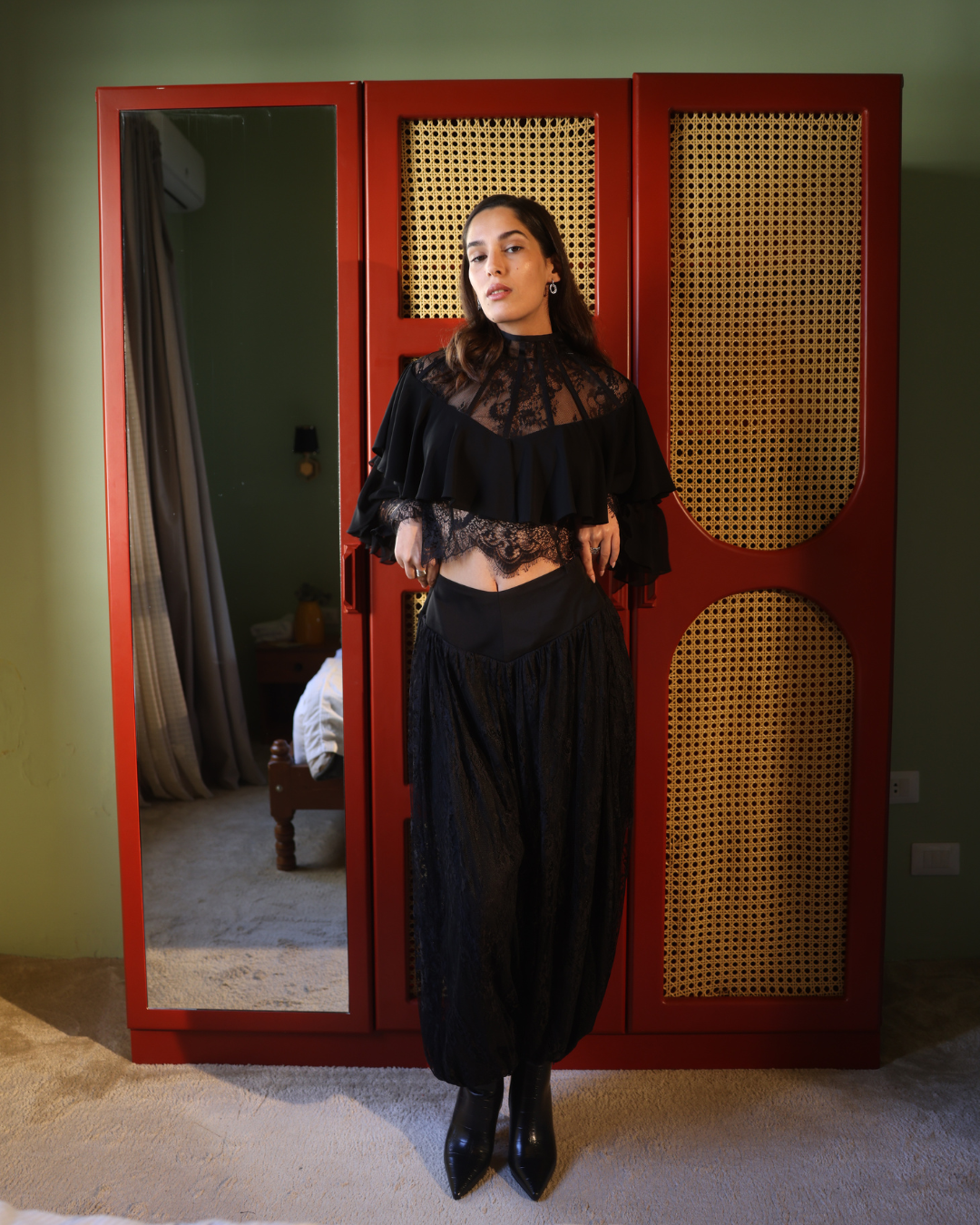 A delicate black lace set featuring fluid balloon pants. Softness, interpreted as intention — not fragility.