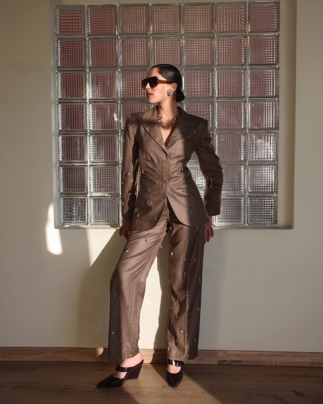 A tailored brown suit with soft pleating at the waist and subtle crystal detailing. Strength, built through structure and repetition.