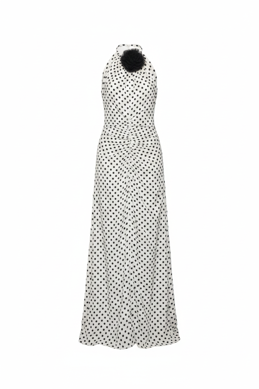 A white polka dot dress accented with a black floral detail. Designed to exist fully in the moment — uncomplicated and aware.