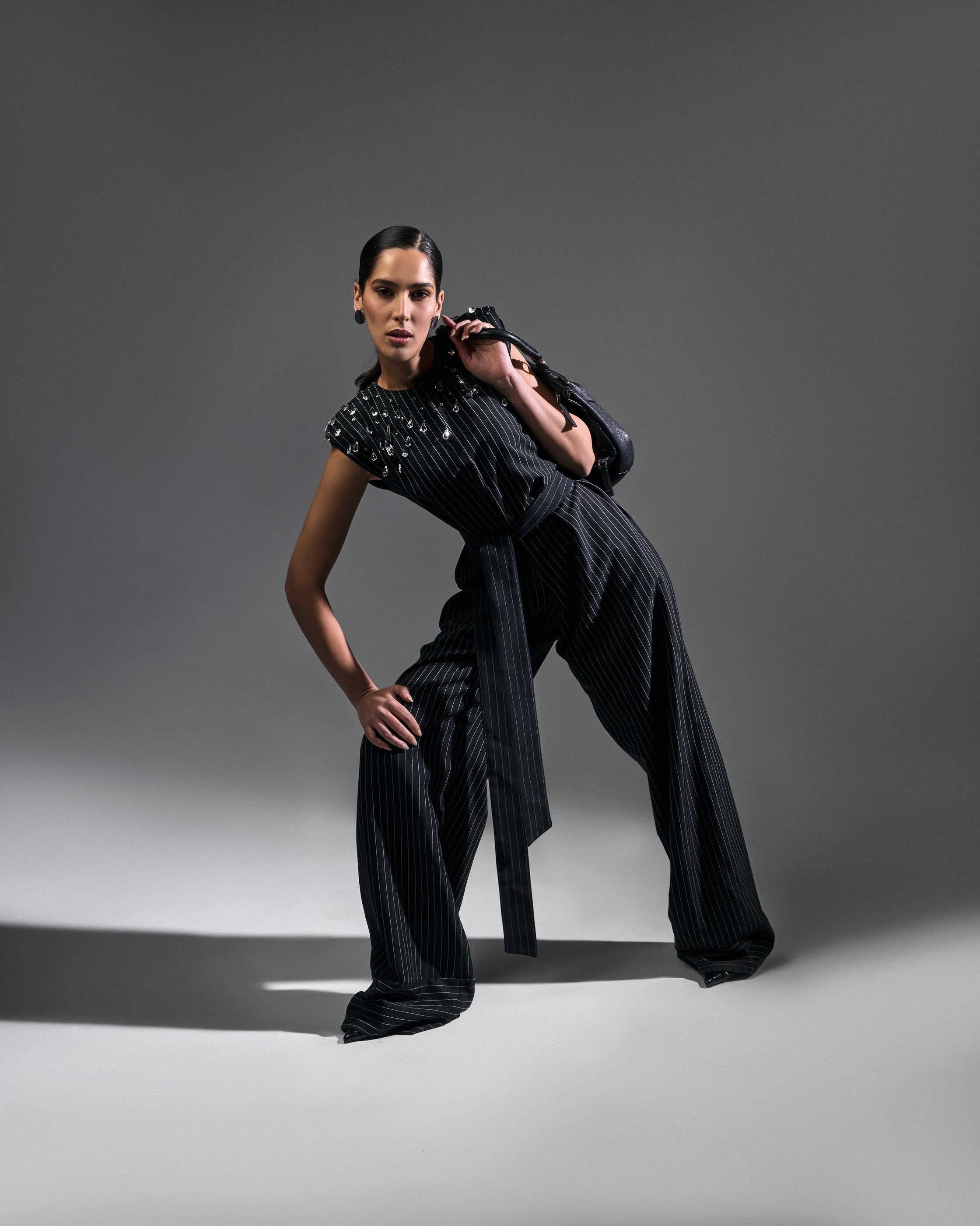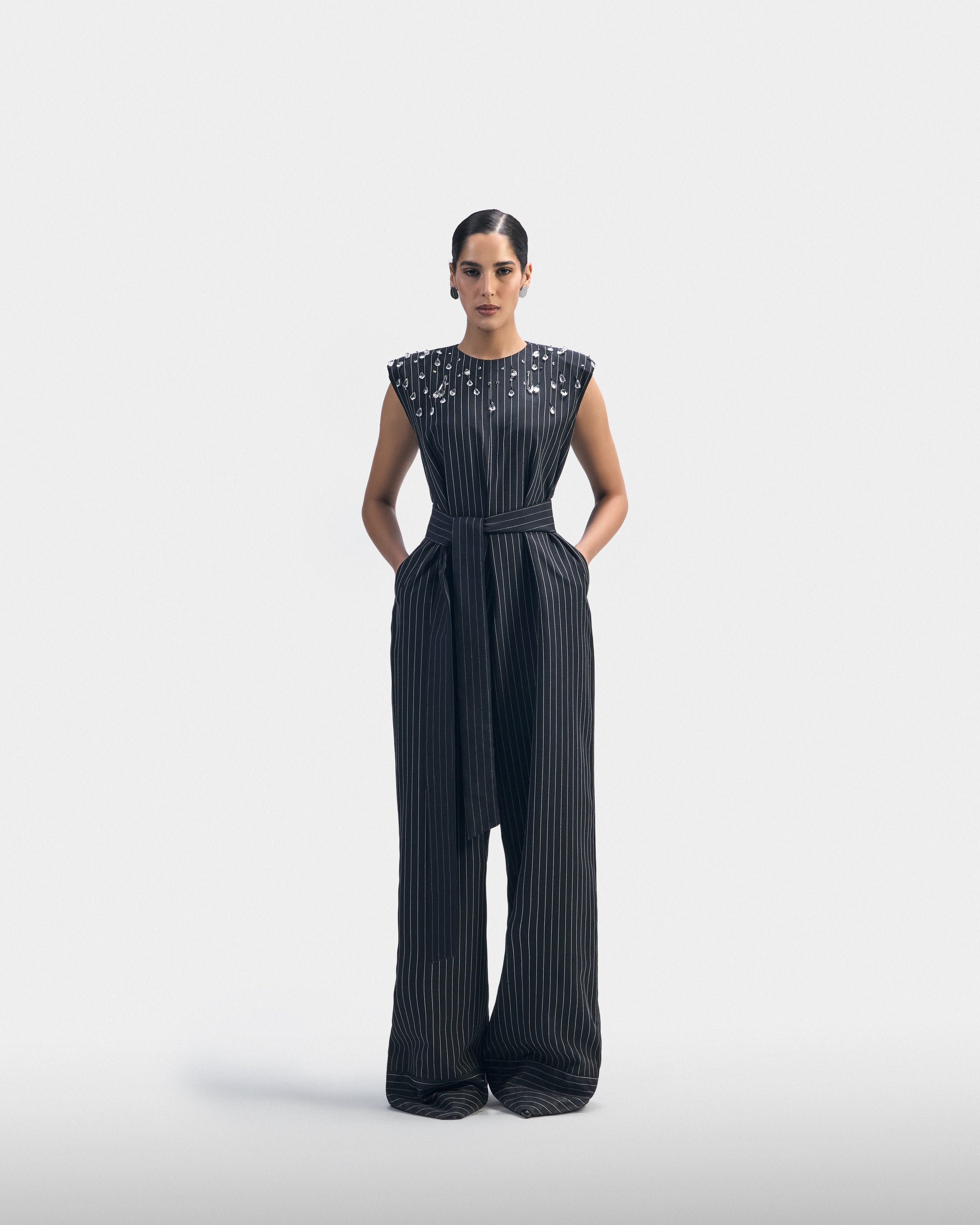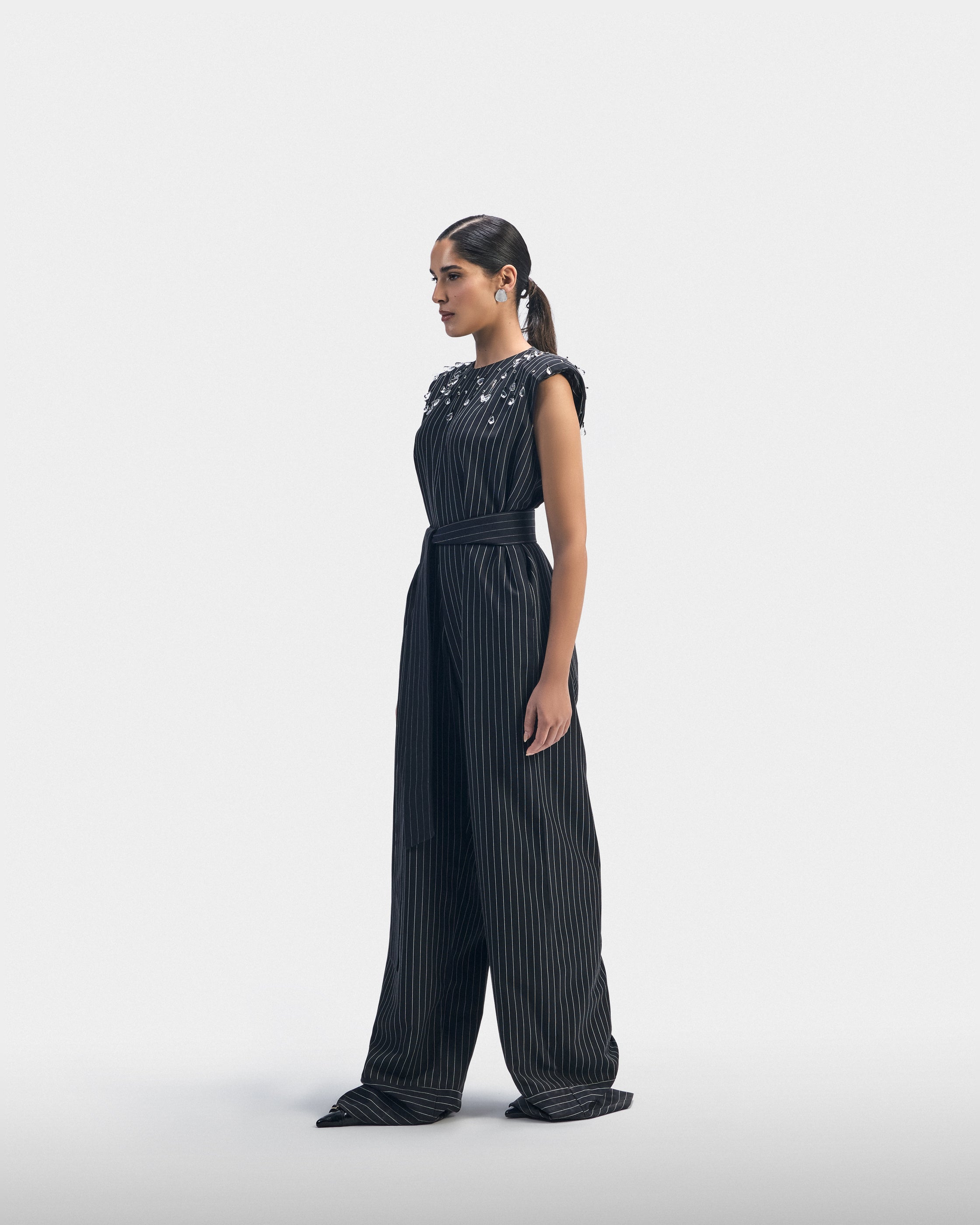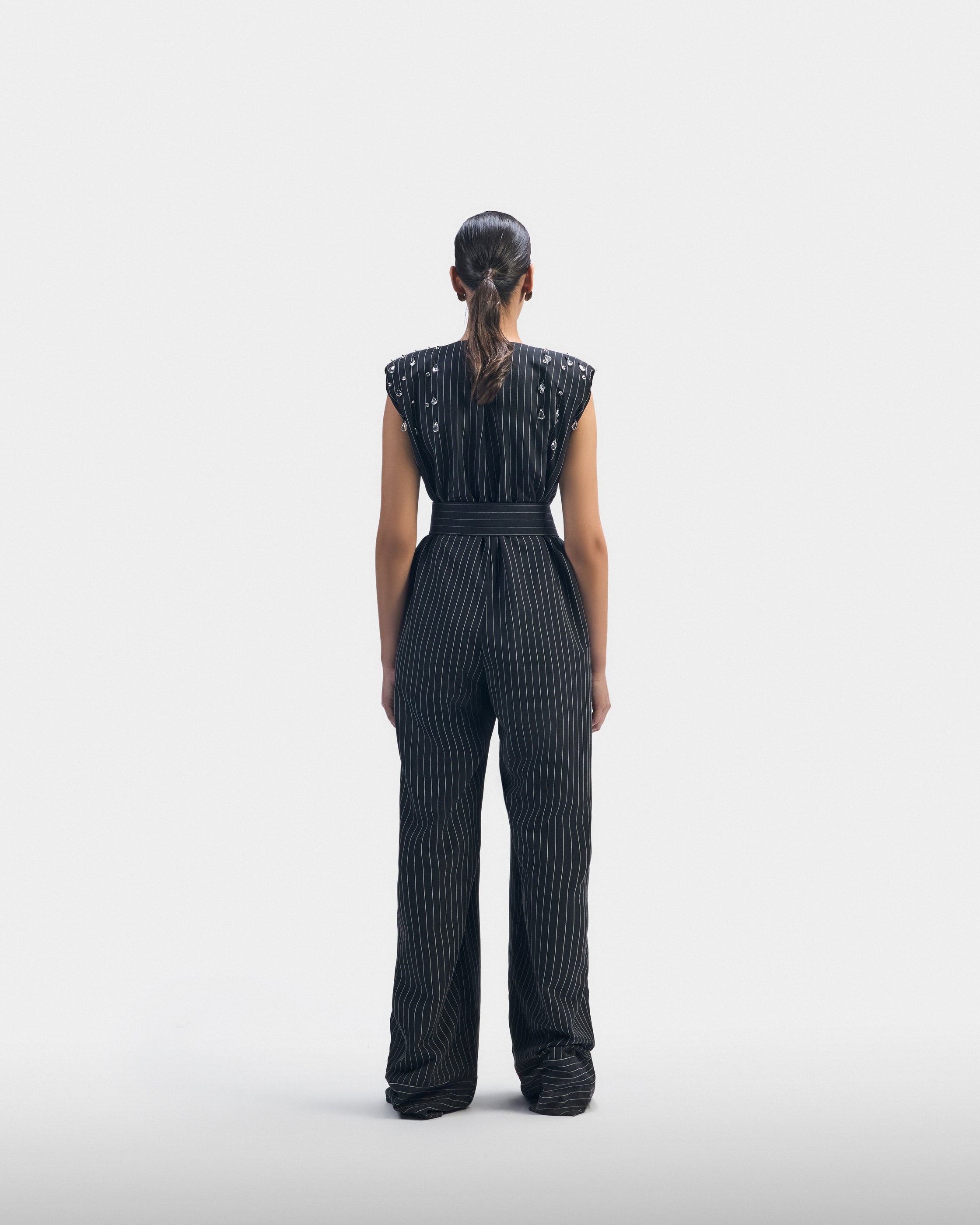 A tailored black striped piece with padded shoulders and subtle crystal details. Built for structure, movement, and continuity.