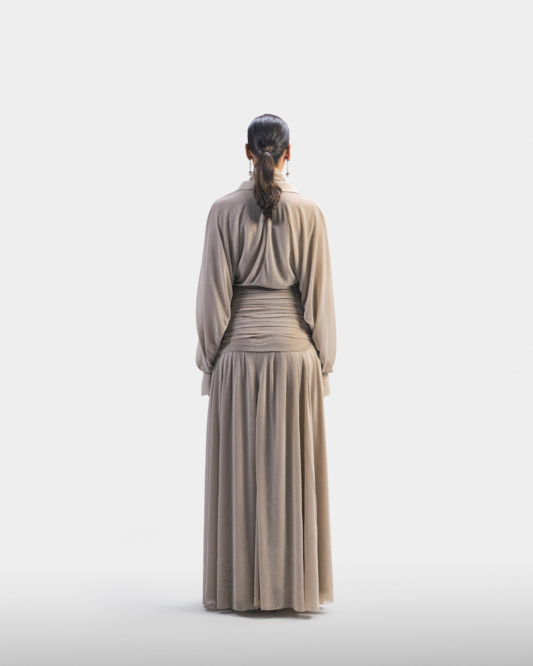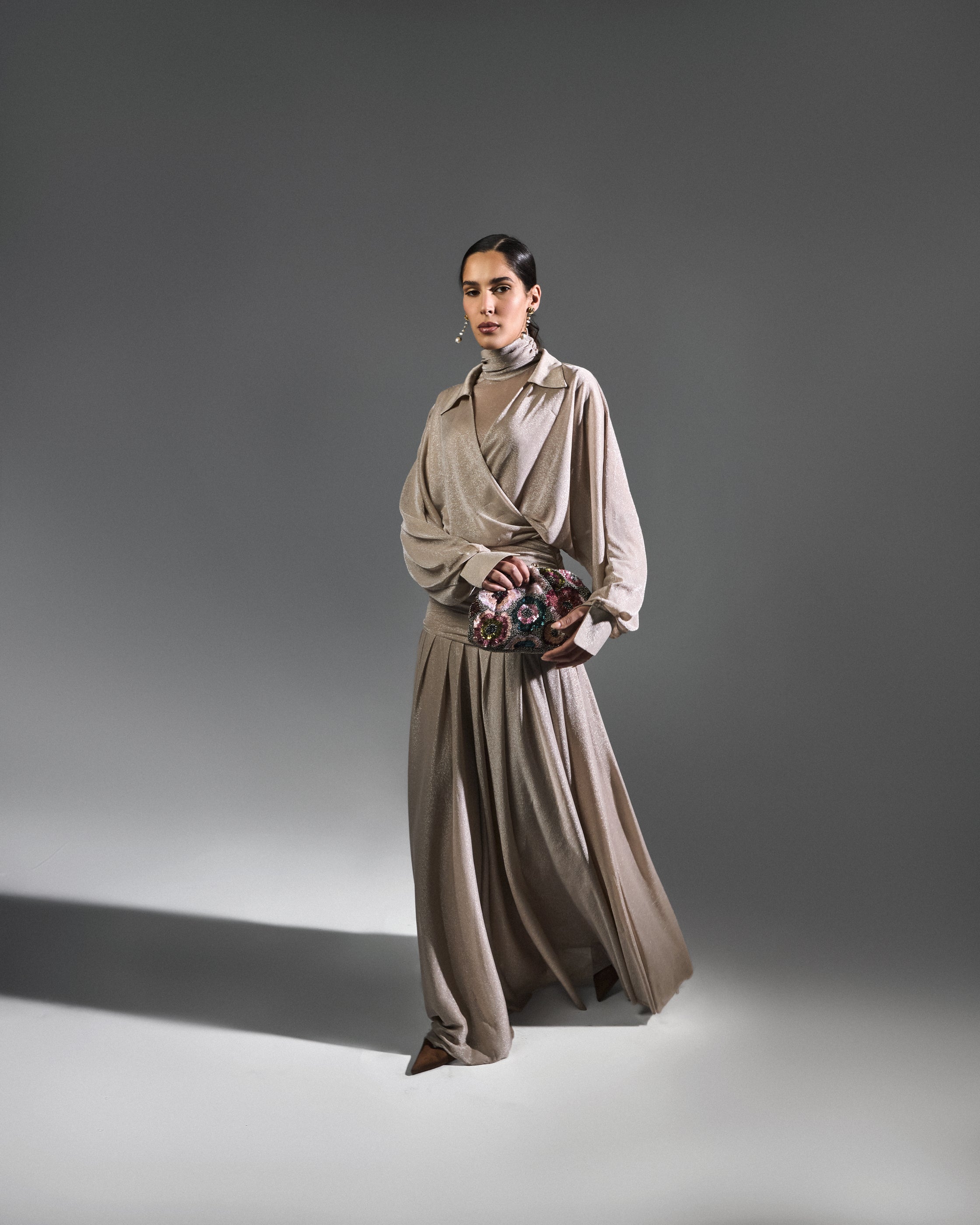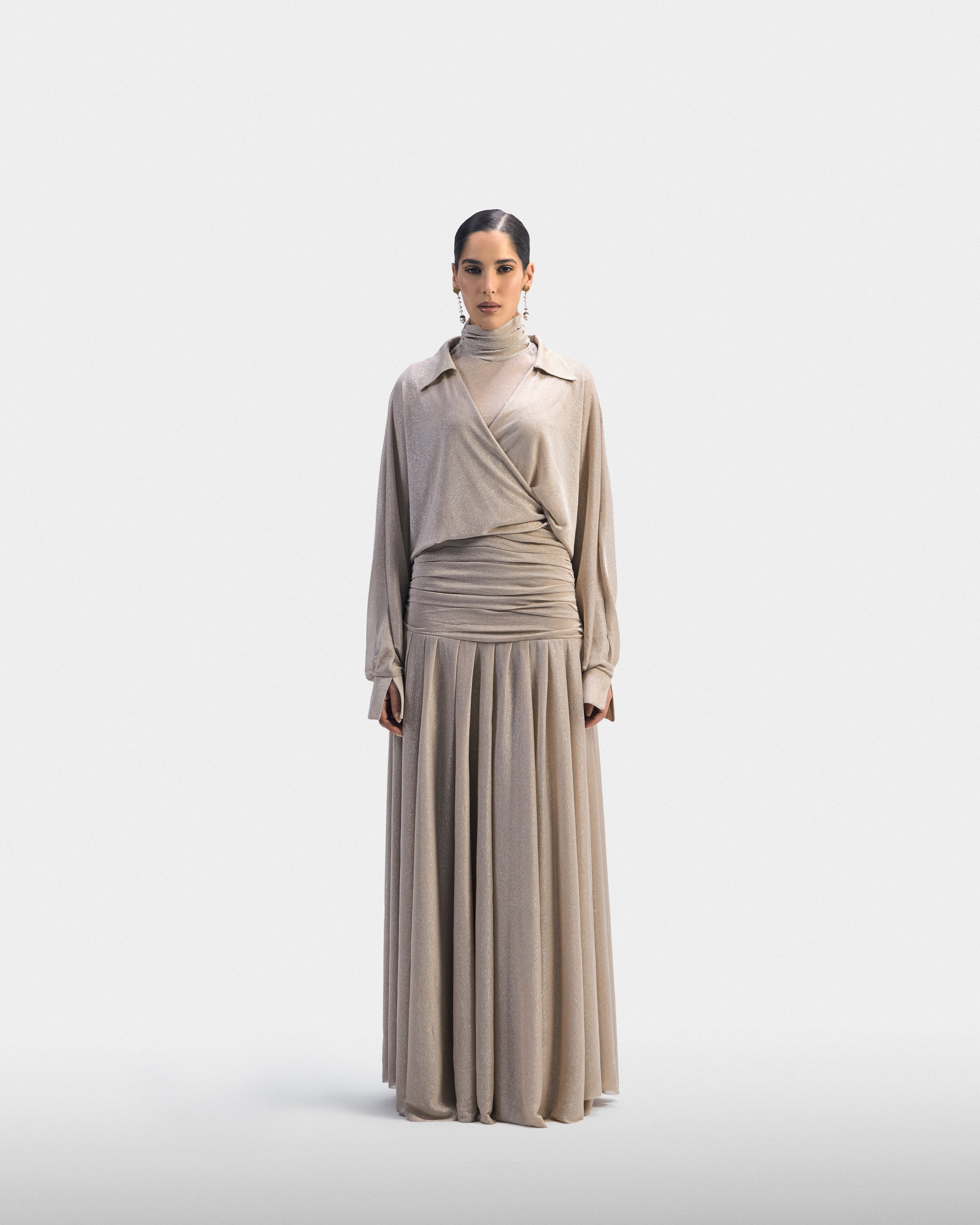 A Shimmery, floor length wrap silhouette featuring a draped waist and an elegant, detachable high-neck inner layer.